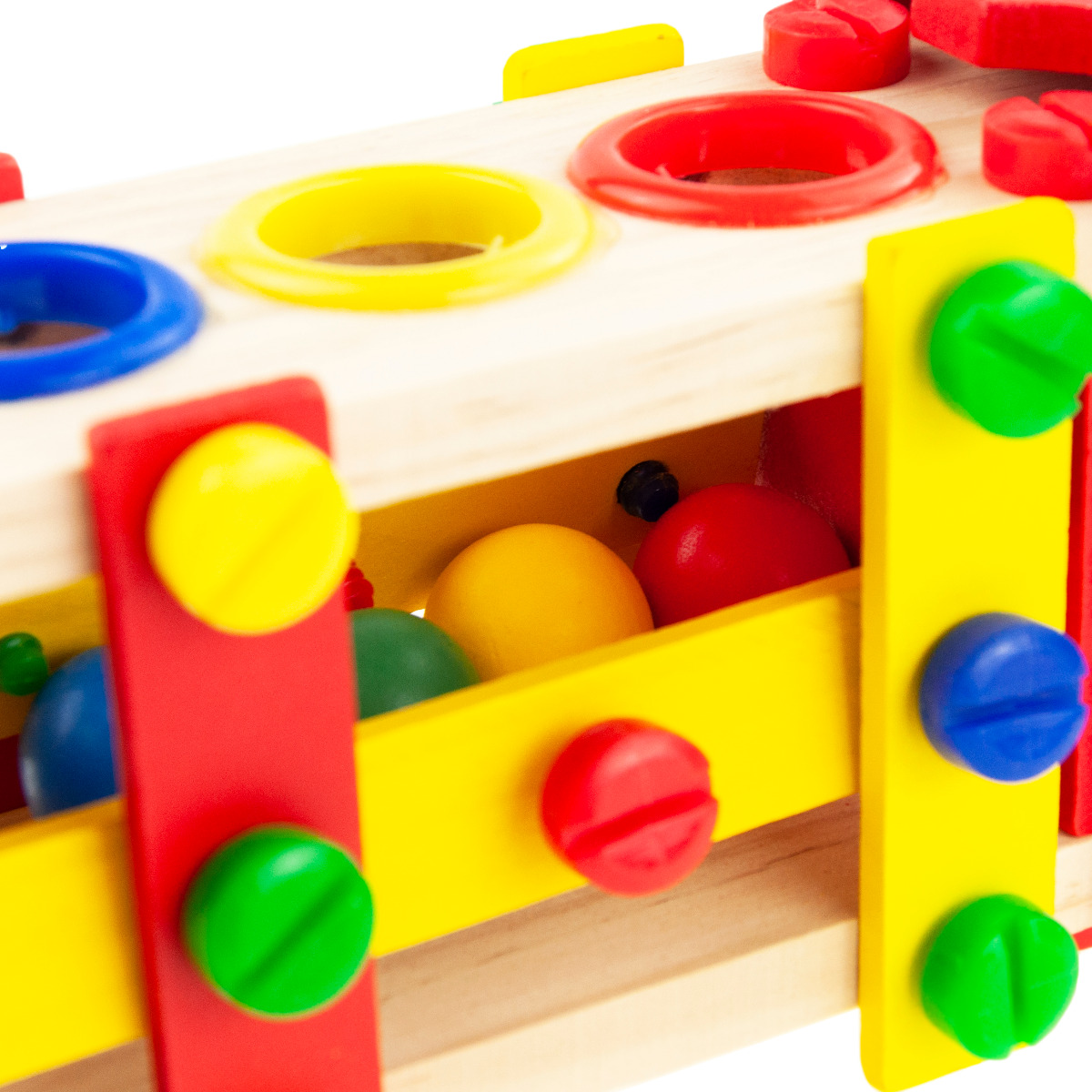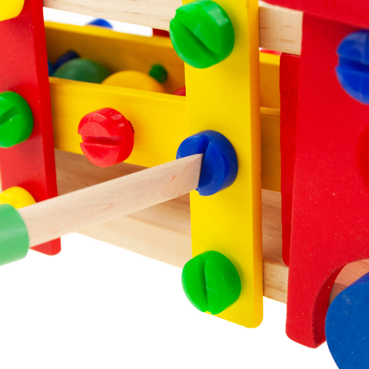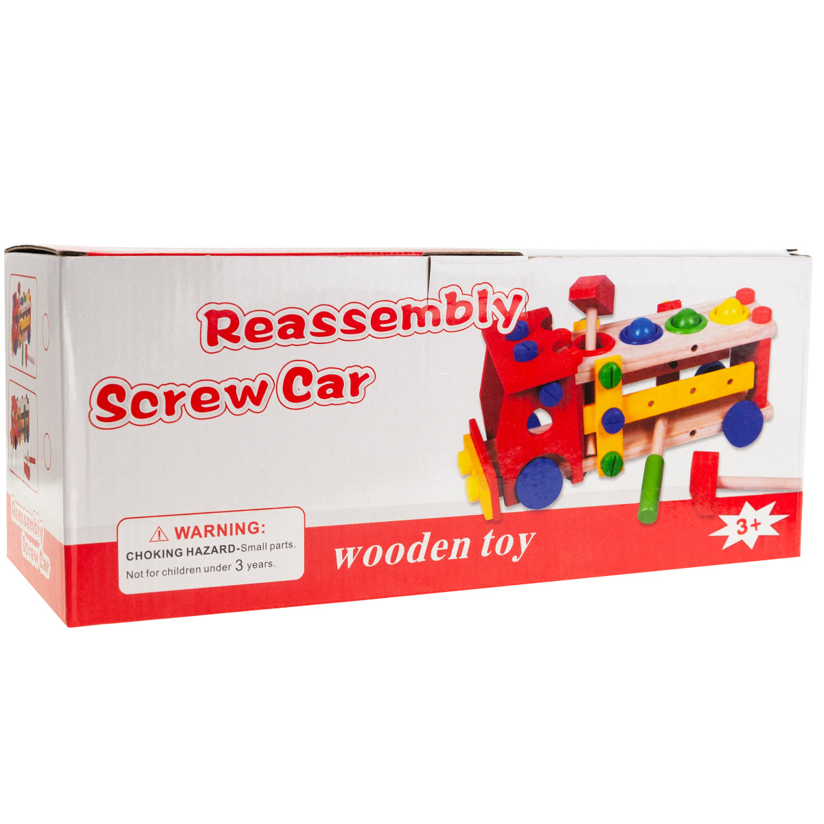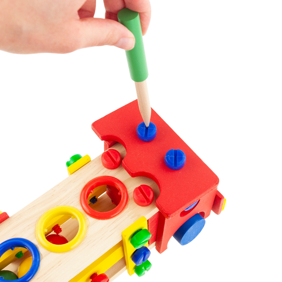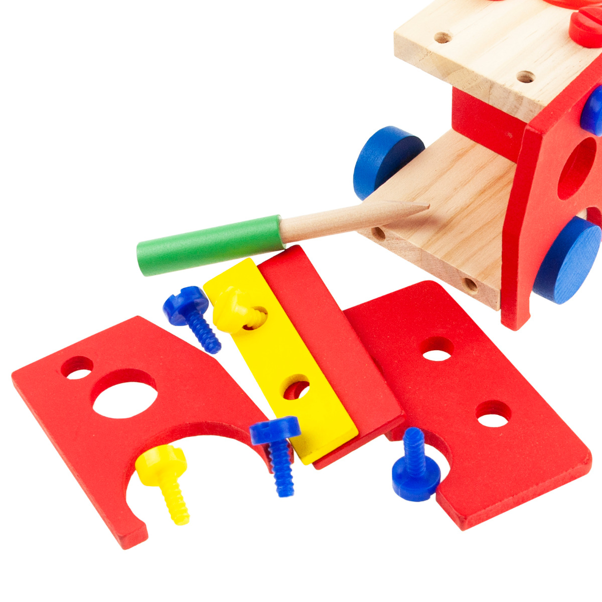 W zestawie oprócz samochodu znajdują się cztery kolorowe, drewniane kuleczki, które dziecko może wbijać młotkiem do ciężarówki poprzez specjalne otwory, oznaczone odpowiednimi kolorami. Dołączony drewniany śrubokręt umożliwia przykręcanie i odkręcanie śrub w zabawce. Różnorodne elementy niewątpliwie czynią zabawę bardziej atrakcyjną.