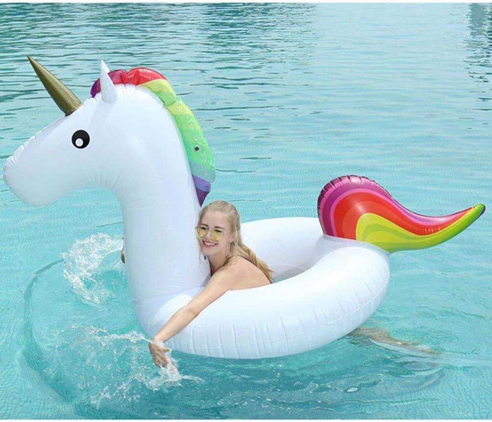 Koło do pływania w kształcie jednorożca. Przykuje uwagę wszystkich osób spędzających wolne chwile na plaży.