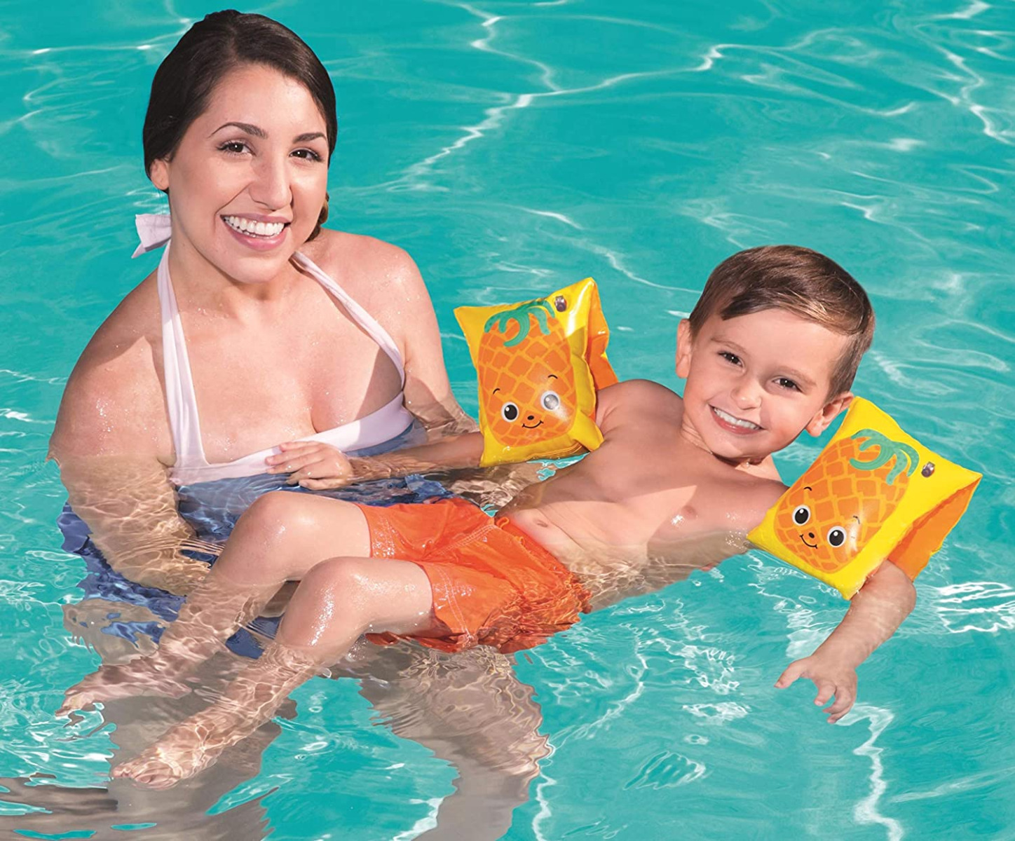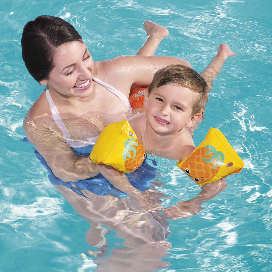Rękawki do pływania firmy Bestway są niezbędne do zapewnienia bezpieczeństwa dziecku, które nie umie jeszcze samodzielnie pływać. Wykonane są z tworzywa PCV z uroczą kolorową owocową grafiką, która z pewnością przypadnie do gustu każdemu dziecku. Rękawki posiadają dwie niezależne komory powietrzne oraz zawory bezpieczeństwa. Dzięki niewielkiemu ciężarowi oraz wymiarom 23 cm x 15 cm, rękawki będą idealne dla dzieci w wieku 3-6 lat. Rękawki przeznaczone są tylko i wyłącznie do użytku w wodzie, na głębokości pozwalającej dziecku wyczuć dno, pod opieką rodzica.