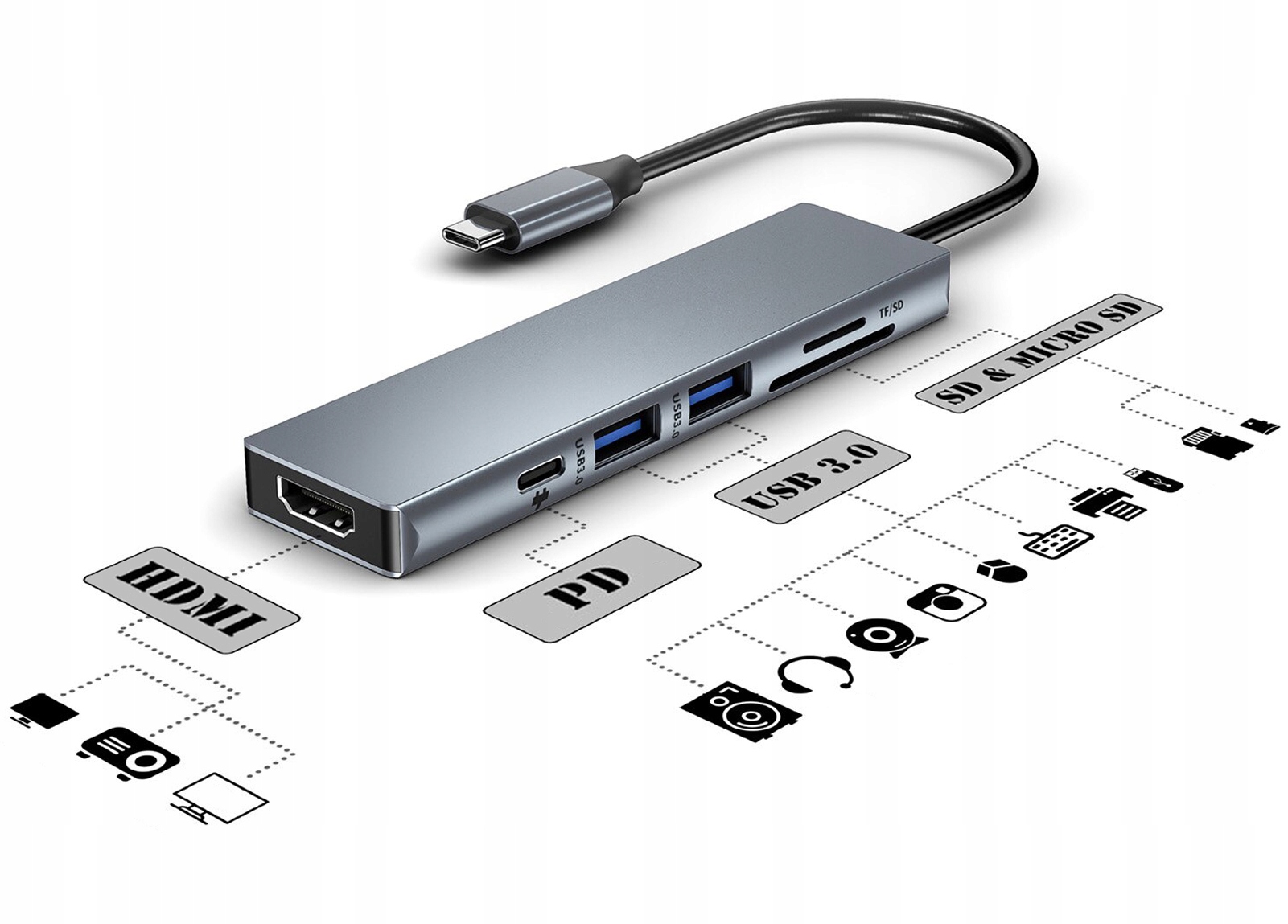?Jeśli po zakupie laptopa okazało się, że nie ma w nim czytnika kart pamięci, wejścia hdmi lub brakuje Ci portów USB to ten sprzęt jest idealny dla Ciebie! Adapter umożliwia podłączenie:?