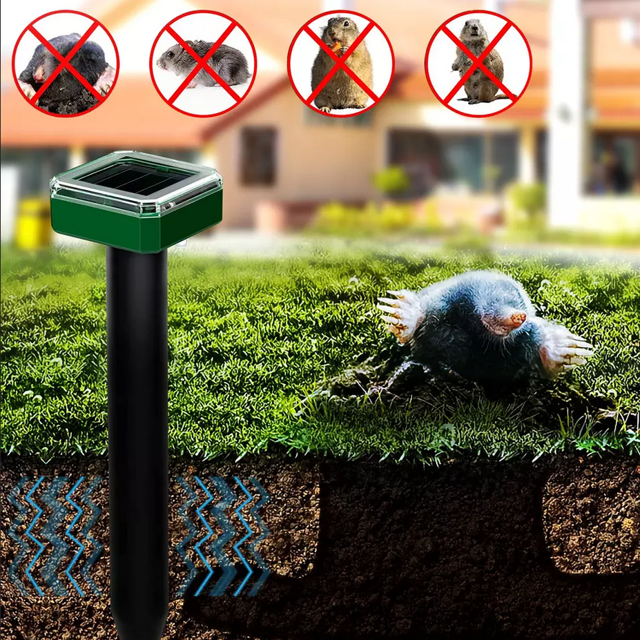 - Fabrycznie nowy, wysokiej jakości solarny odstraszacz na krety i gryzonie o zmiennej częstotliwości dźwięku.