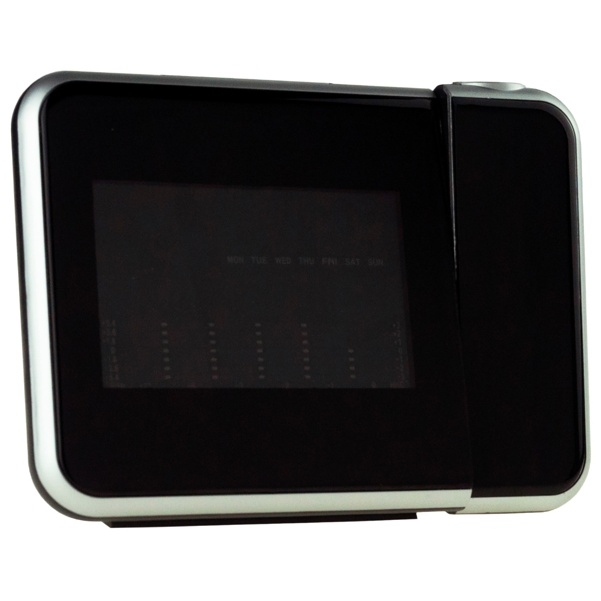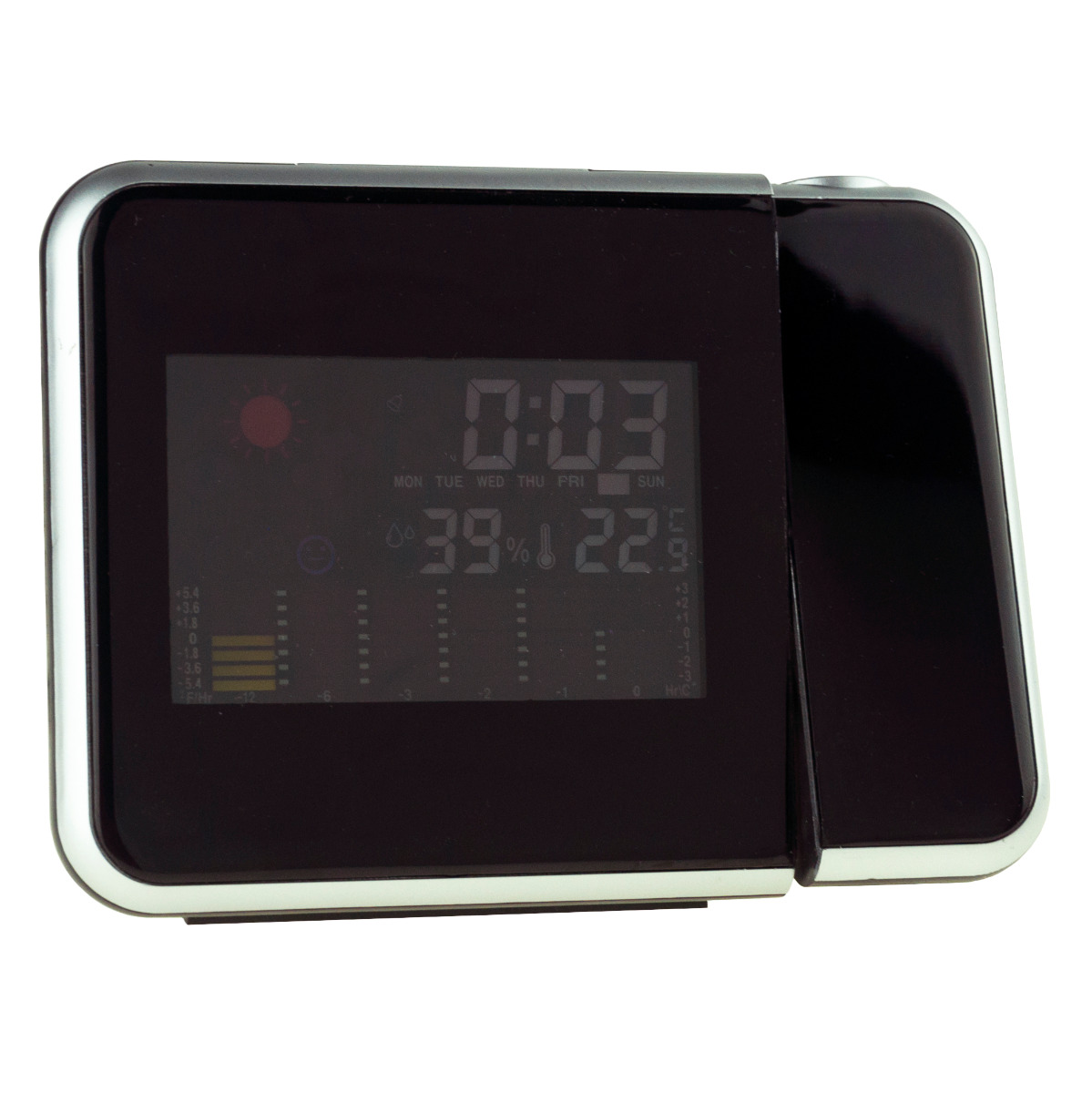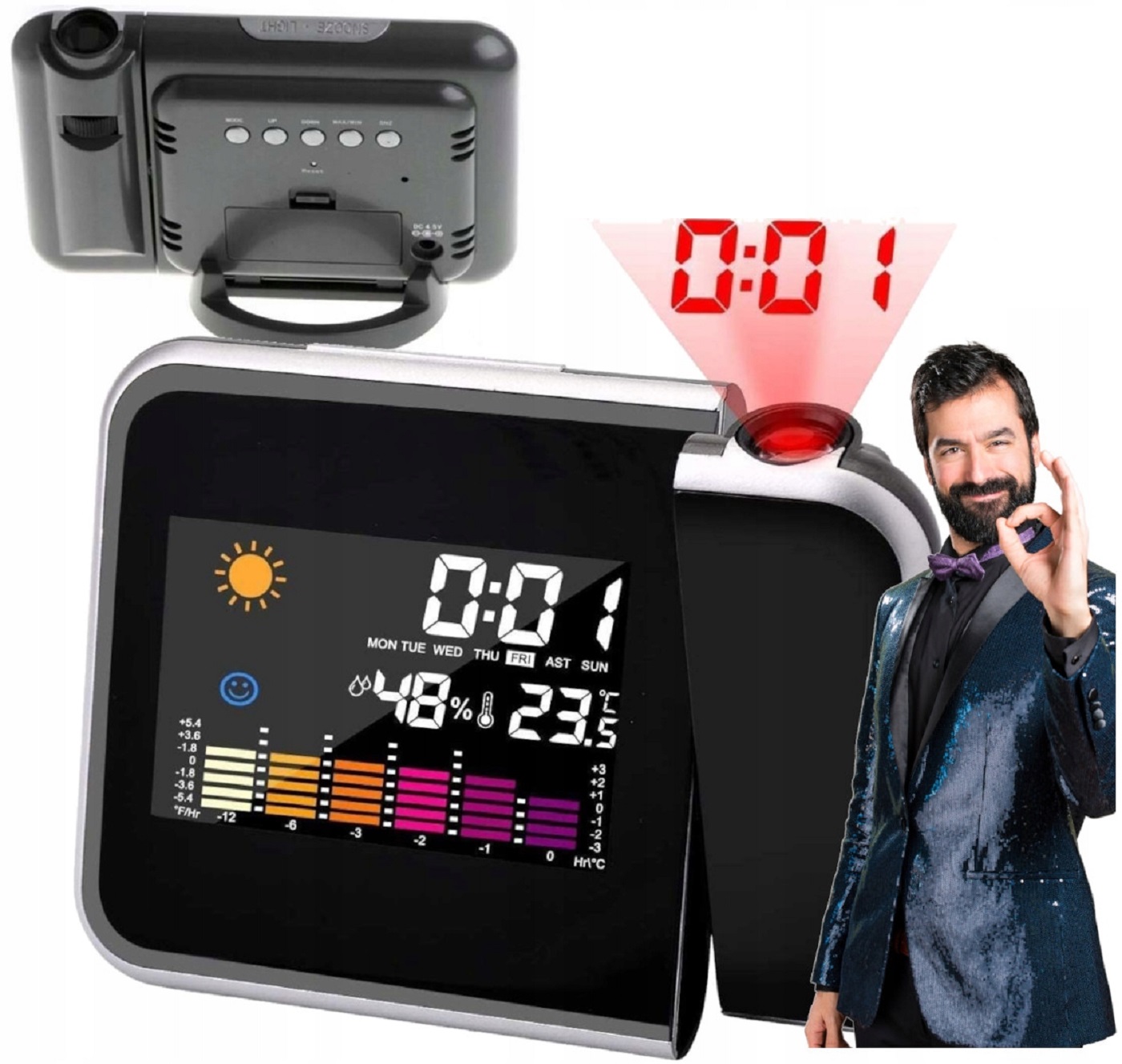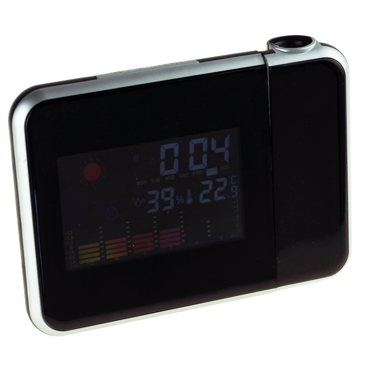 Cyfrowa stacja pogody z zegarkiem, budzikiem, kalendarzem oraz z wbudowanym laserowym projektorem godziny. Urządzenie posiada duży i czytelny, kolorowy wyświetlacz LCD o przekątnej 3,7'', na którym wskazywany jest pomiar temperatury wewnętrznej w stopniach Celsjusza lub Fahrenheita, wilgotności powietrza w % oraz aktualnej i przewidywanej prognozy pogody. Wbudowany, regulowany projektor umożliwia odczyt godziny nawet w całkowitych ciemnościach. Urządzenie bardzo przydatne, swoim wyglądem z pewnością stanowi ozdobę.