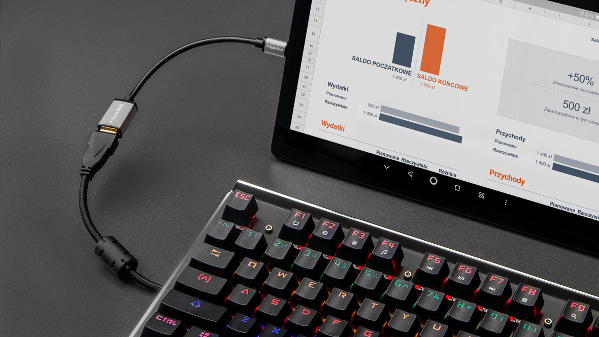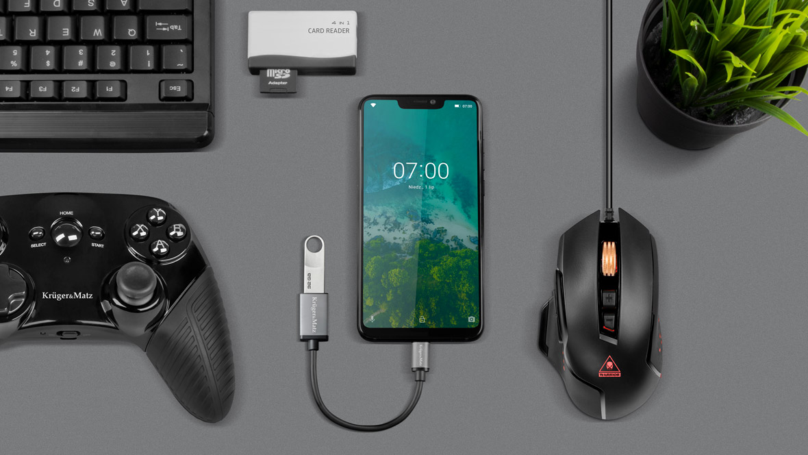 Podłączenie pamięci zewnętrznej to nie jedyna korzyść jaka płynie z posiadania adaptera Kruger&Matz. Dzięki temu niepozornemu urządzeniu możesz zwiększyć także funkcjonalność swojego tableta. Podłącz klawiaturę, aby stworzyć sobie wygodne narzędzie pracy. Kabel przypadnie również do gustu fanom gier na smartfona – z jego pomocą można podłączyć pad zwiększając komfort podczas gry.
