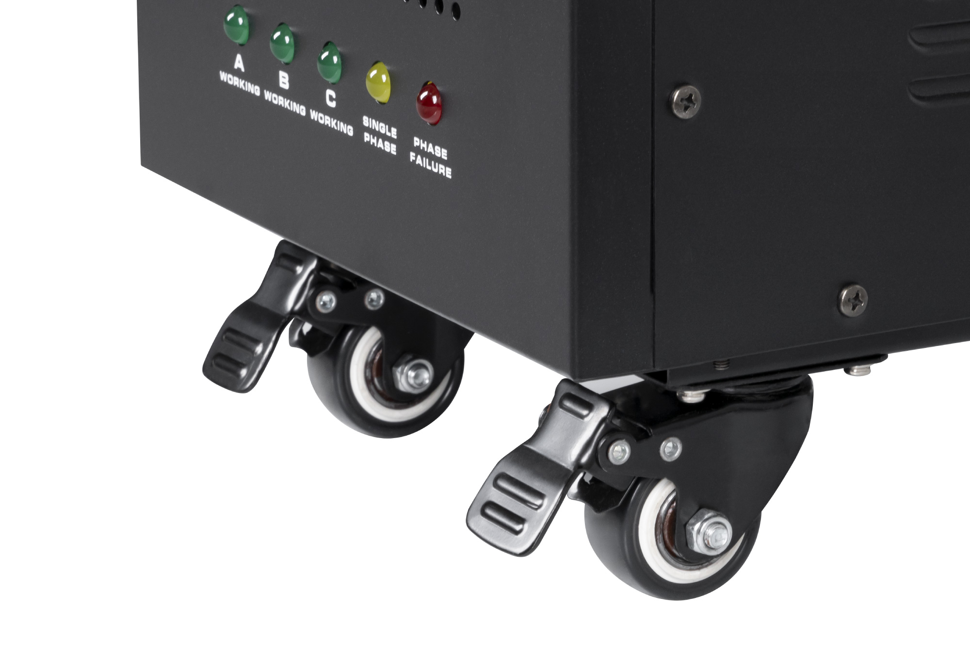 W trybie trójfazowym istotne jest zachowanie równowagi między fazami. Stabilizator monitoruje i kontroluje napięcie na każdej fazie, aby zapewnić zgodność między nimi - wyrówna zbyt wysokie lub zbyt niskie napięcie wejściowe i poda na wyjście napięcie po stabilizacji. Jeżeli w tym trybie któraś z faz nie zadziała poprawie lub jest nie podłączona, to w urządzenie uruchomi zabezpieczenie i nie poda napięcia na wyjście, informując o tym poprzez kontrolkę „BŁĄD FAZY”.