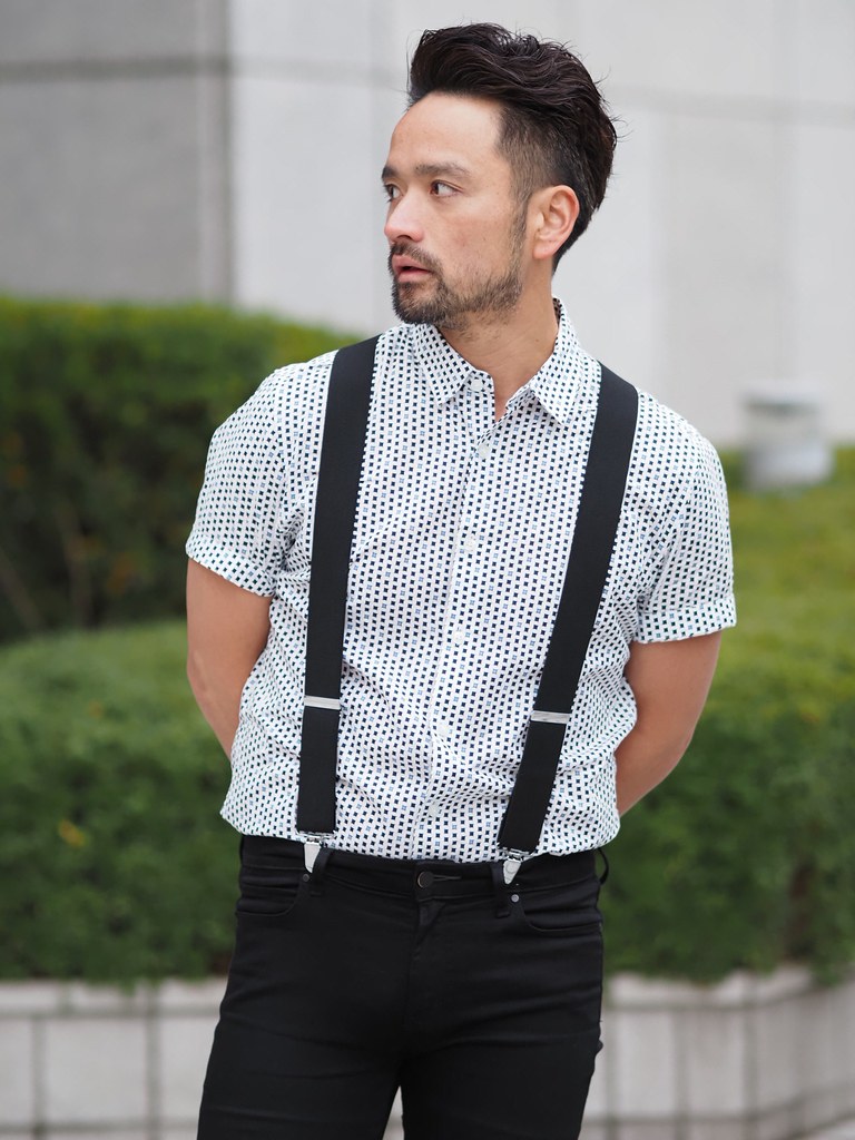 Eleganckie, wąskie szelki do spodni typu Y - 3 klamrowe! Zbudowane z trzech pasków zszytych estetyczną skórzaną łatką. Idealnie dopasowują sie do ciała i dobrze podtrzymują spodnie.