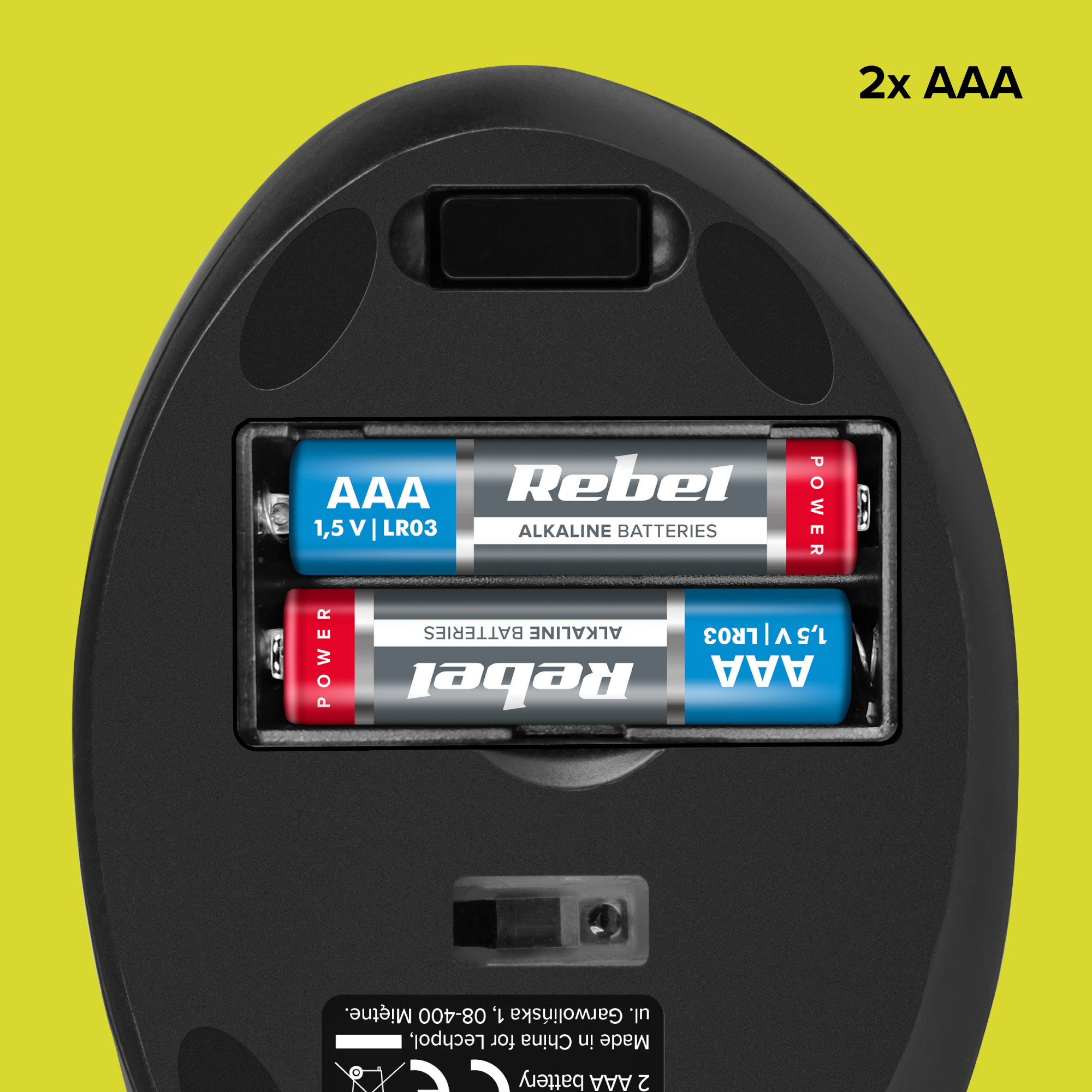 Mysz zasilana jest dwiema bateriami AAA, co zapewnia długotrwałe działanie bez konieczności częstej wymiany źródła energii. Co ważne niska moc wyjściowa Bluetooth (1 dBm) sprzyja energooszczędnej pracy, co przekłada się na wygodę użytkowania na co dzień.