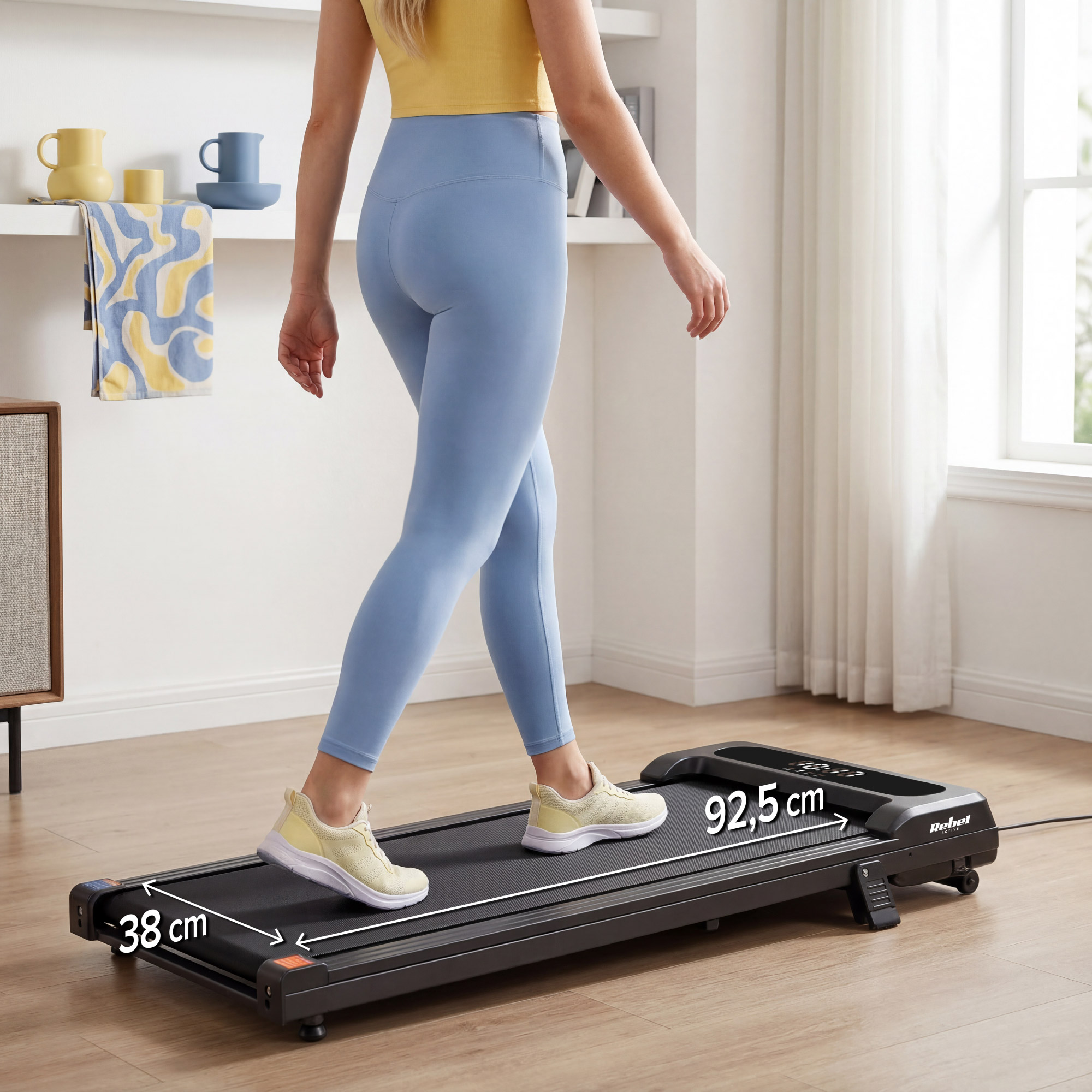 Smukła konstrukcja bieżni Rebel Active zajmuje wyjątkowo mało miejsca. Po skończonym treningu z łatwością wsuniesz ją pod łóżko, kanapę lub szafę. To sprzęt, który nie dominuje przestrzeni, lecz idealnie dopasowuje się do stylu życia w małym mieszkaniu.