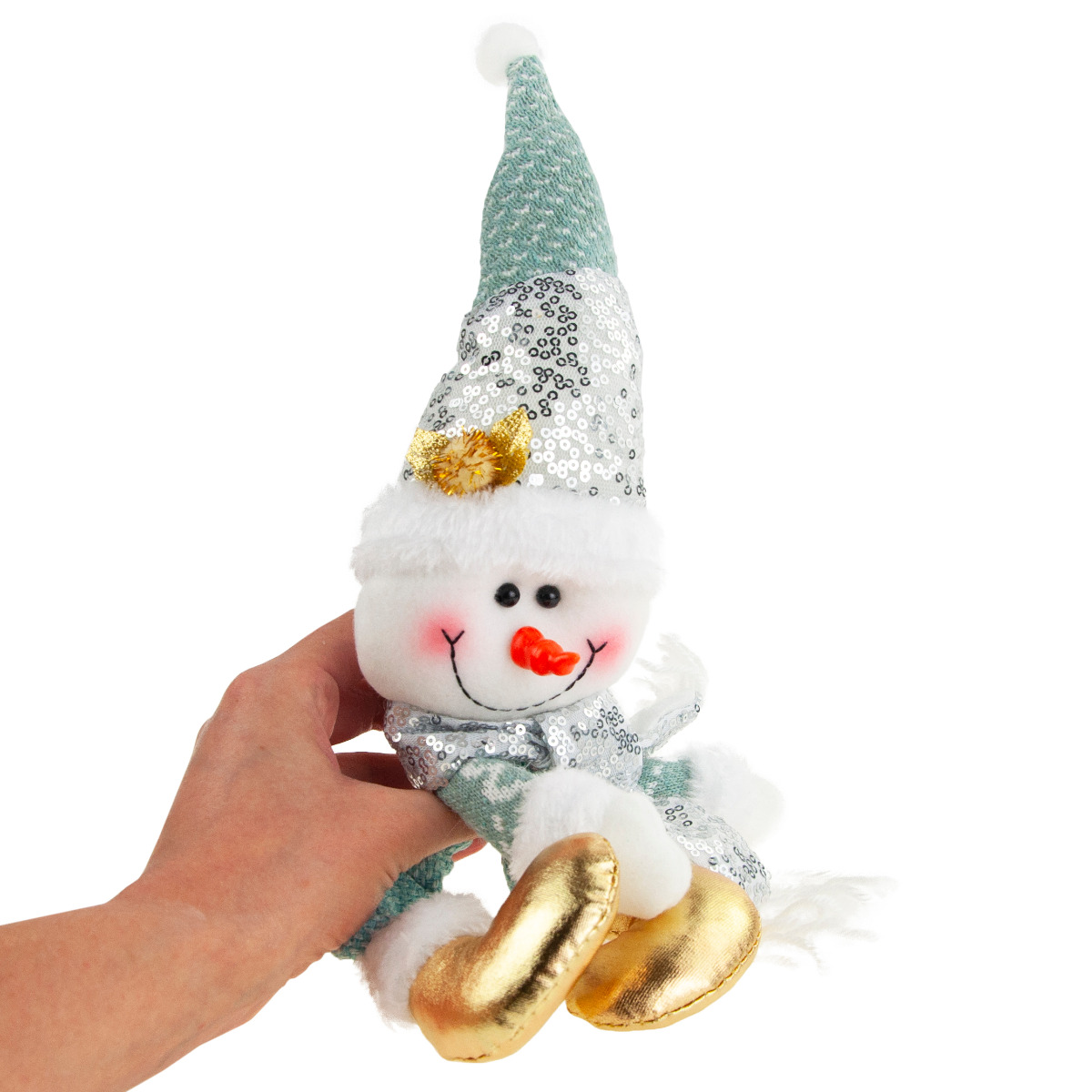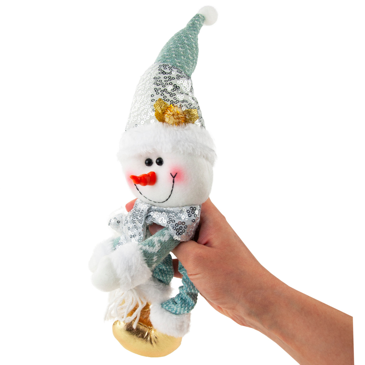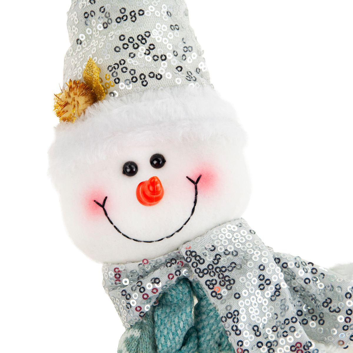 Bałwanek o niesamowicie pogodnej i przyjaznej twarzyczce wywoła uśmiech u najmłodszych i tych trochę starszych. Na buzi bałwanka znajdują się błyszczące czarne oczka, nos - marchewka oraz rumiane policzki. Piękne zimowe ubranko - czapeczka, szaliczek, zimowe, złote buty sprawiają, że wygląda on klimatycznie. Buty, sweterek i czapka posiadają futrzane obszycie. Na ubraniach znajdują się ozdobne cekiny nadające bałwankowi jeszcze bardziej świątecznego charakteru.