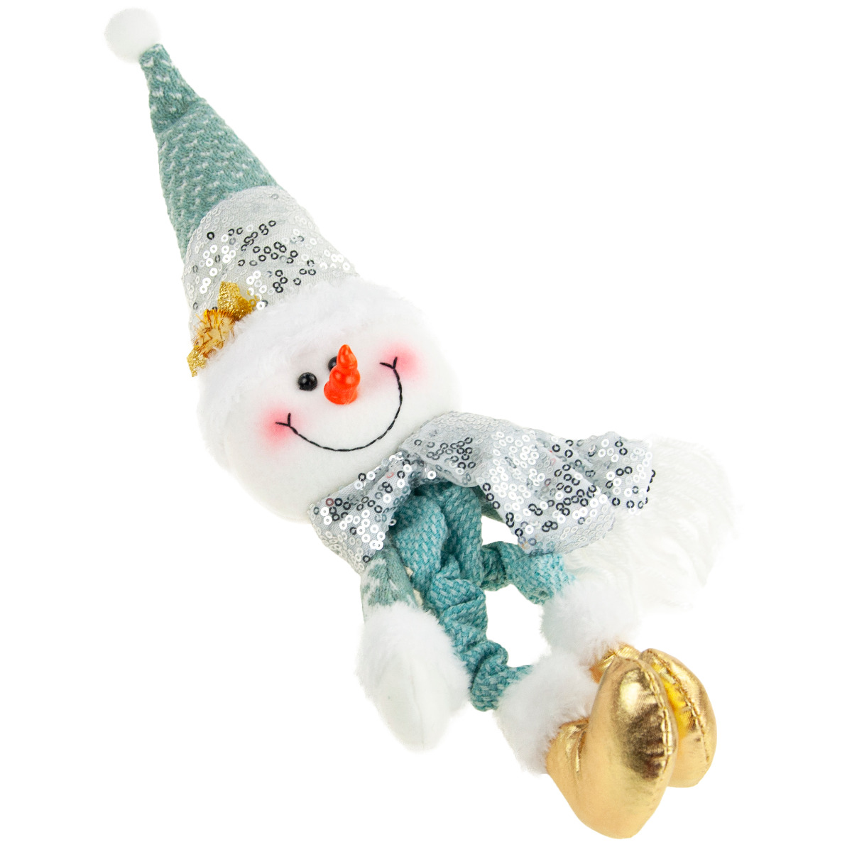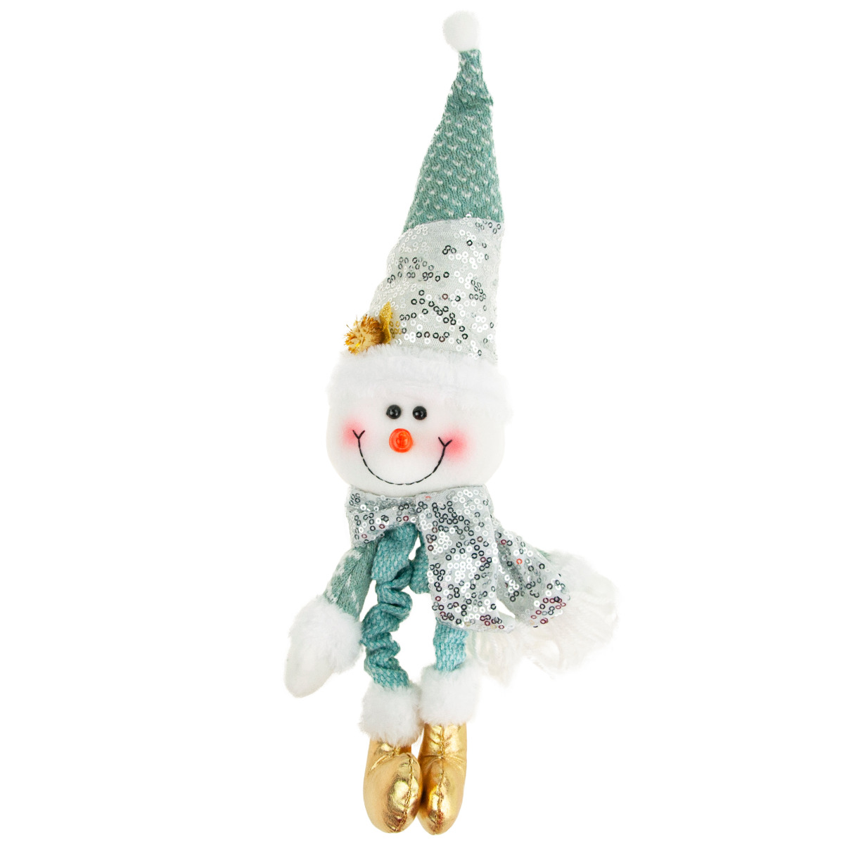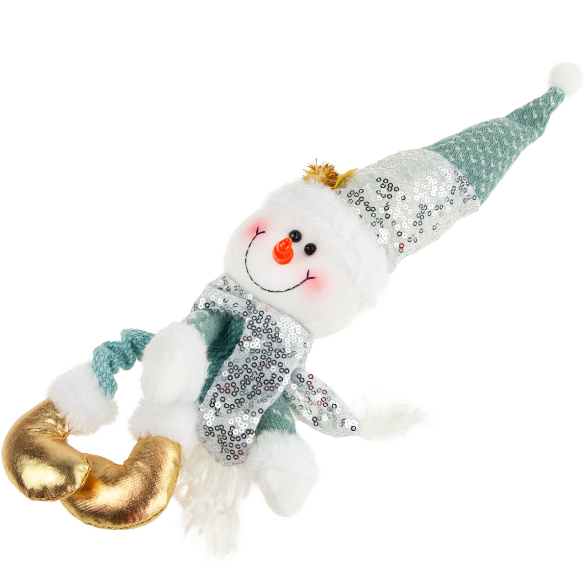 Bałwanek o niesamowicie pogodnej i przyjaznej twarzyczce wywoła uśmiech u najmłodszych i tych trochę starszych. Na buzi bałwanka znajdują się błyszczące czarne oczka, nos - marchewka oraz rumiane policzki. Piękne zimowe ubranko - czapeczka, szaliczek, zimowe, złote buty sprawiają, że wygląda on klimatycznie. Buty, sweterek i czapka posiadają futrzane obszycie. Na ubraniach znajdują się ozdobne cekiny nadające bałwankowi jeszcze bardziej świątecznego charakteru.