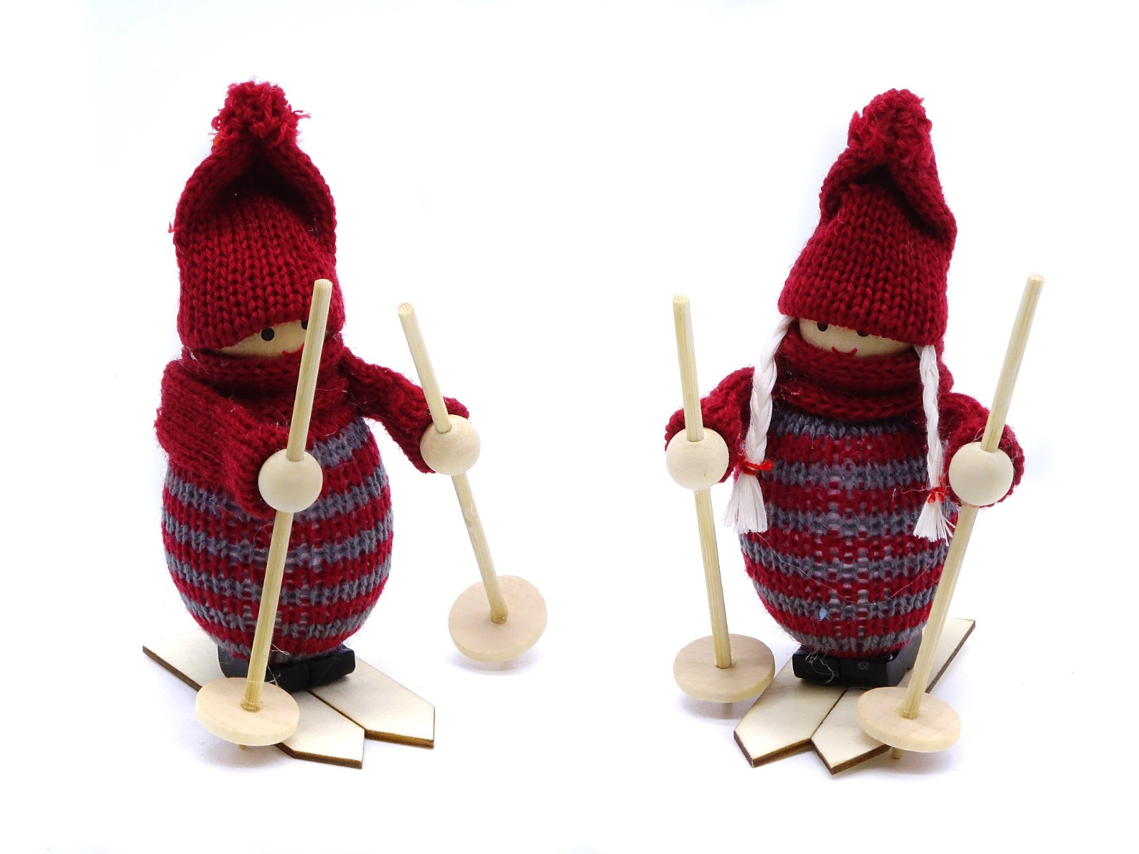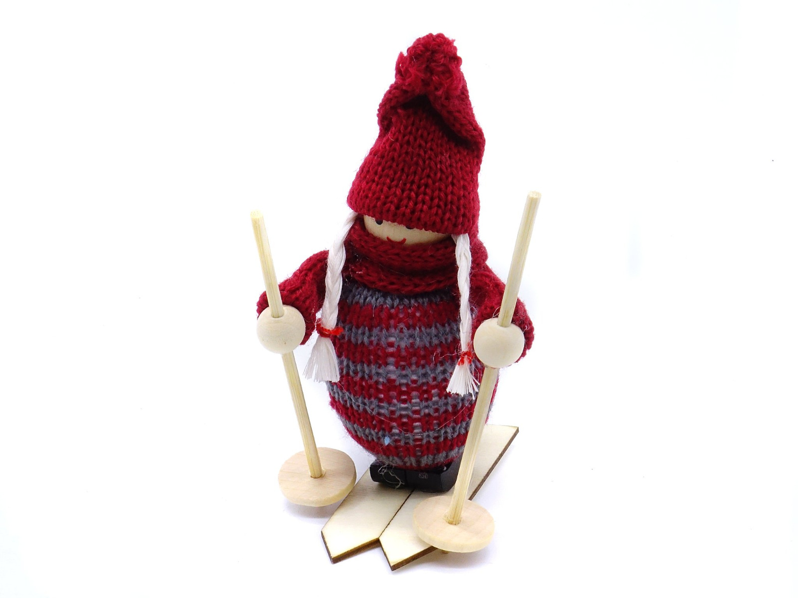 - Drewniana maskotka w zimowym ubranku na nartach z kijkami;