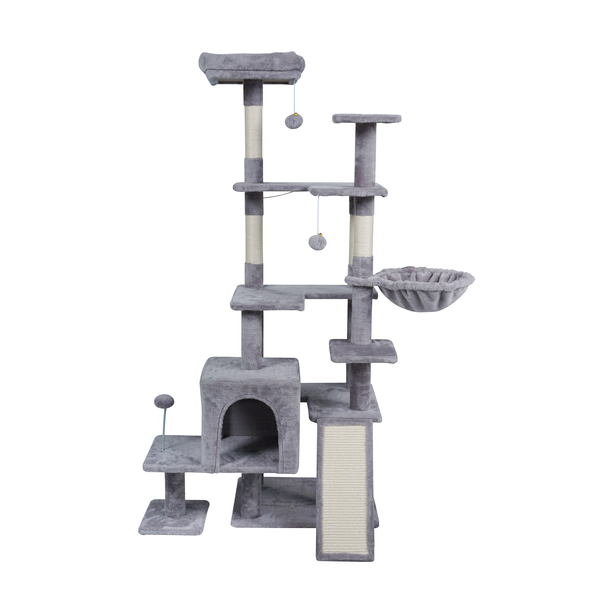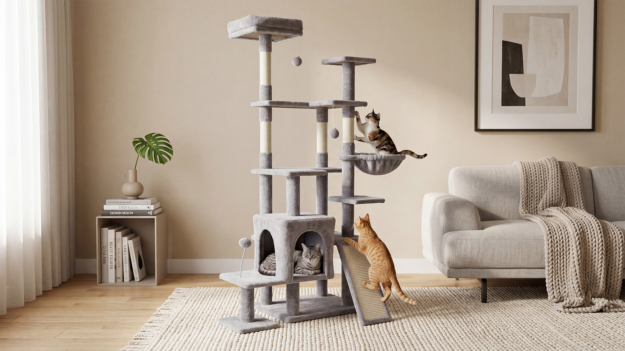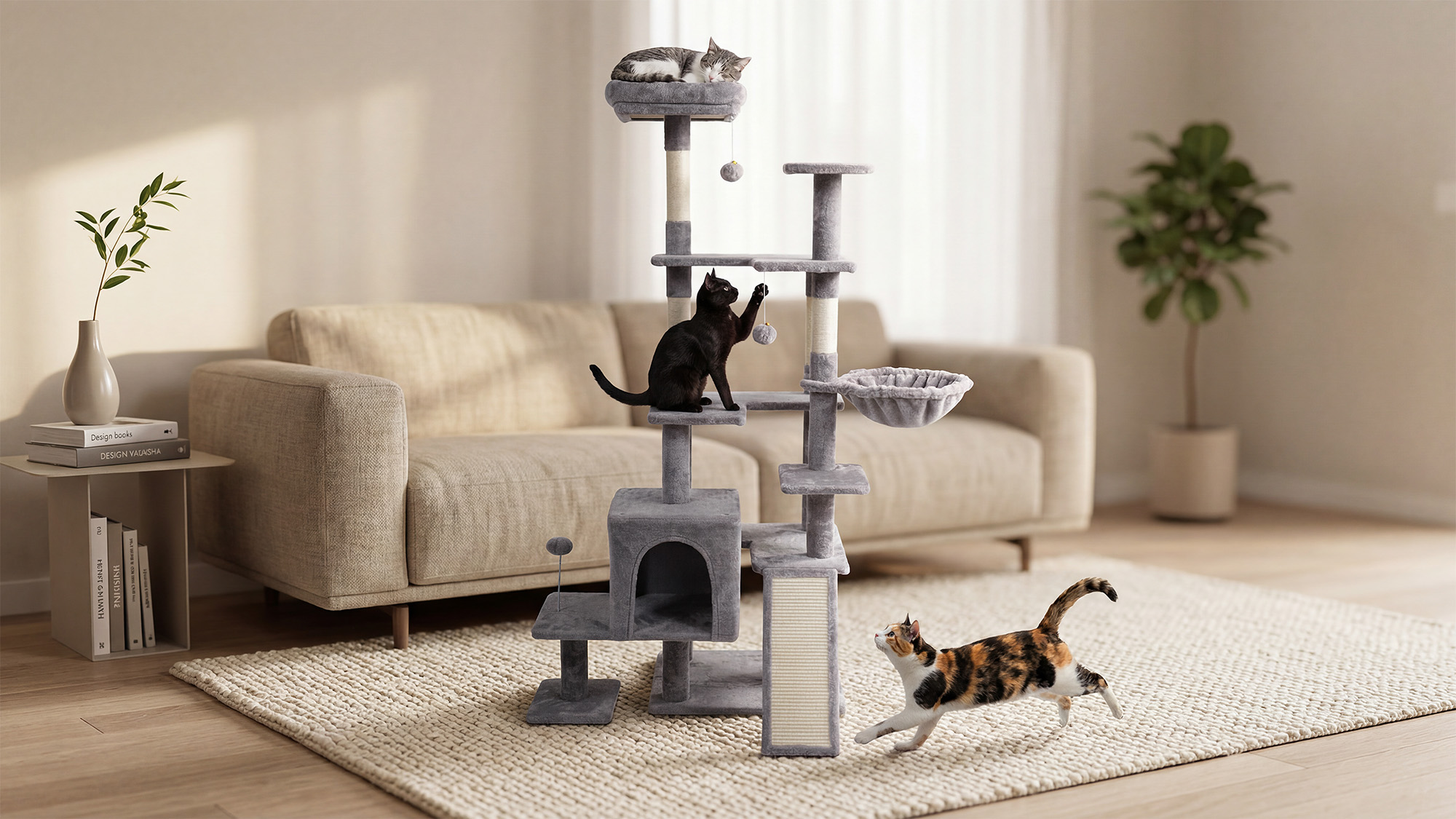 Cztery sizalowe słupki oraz dodatkowa platforma do drapania umożliwiają kotu pielęgnację pazurów i realizację naturalnych instynktów. Trwały sizal jest odporny na zużycie, co zapewnia długotrwałe użytkowanie. To skuteczny sposób na ochronę mebli i zachęcenie kota do aktywności fizycznej.