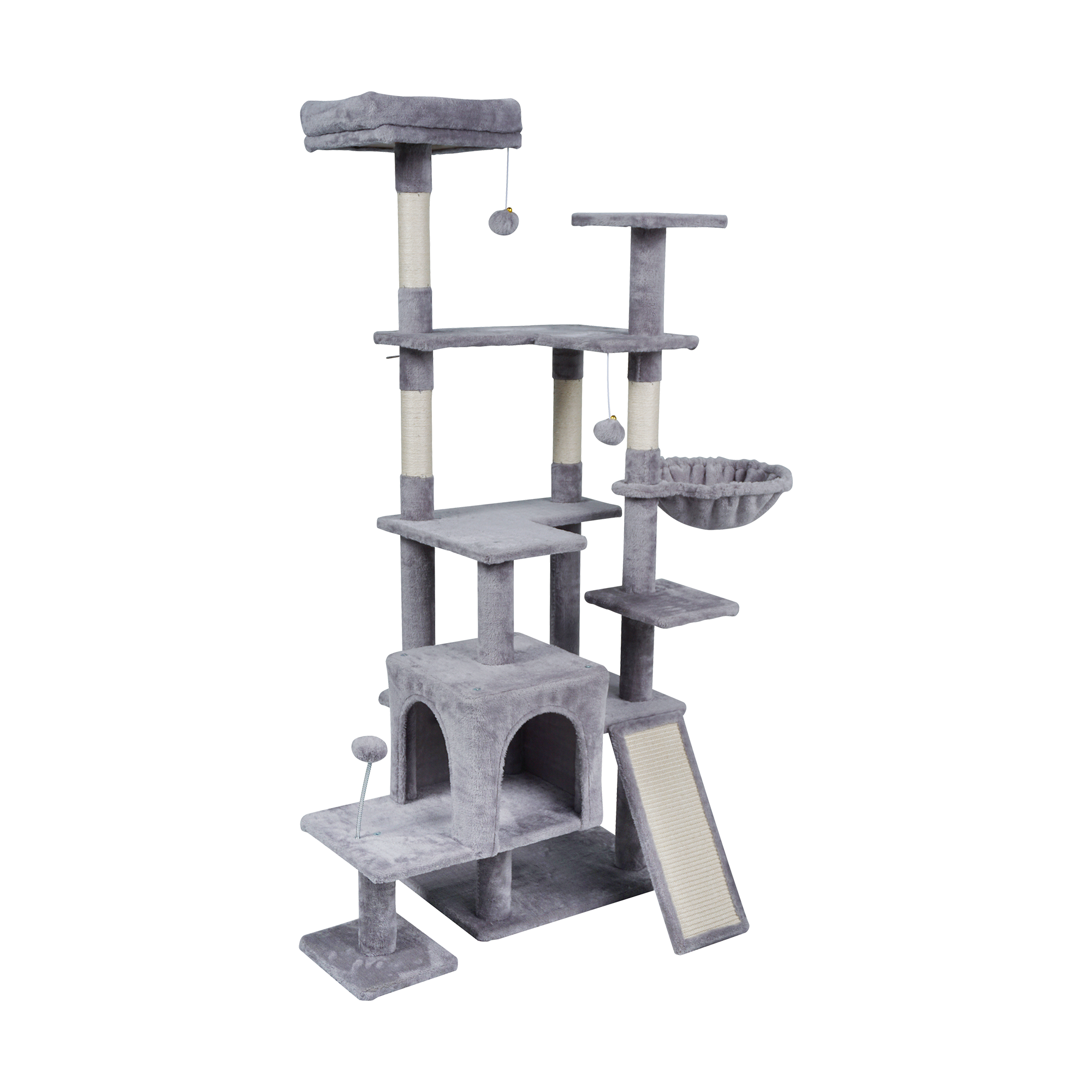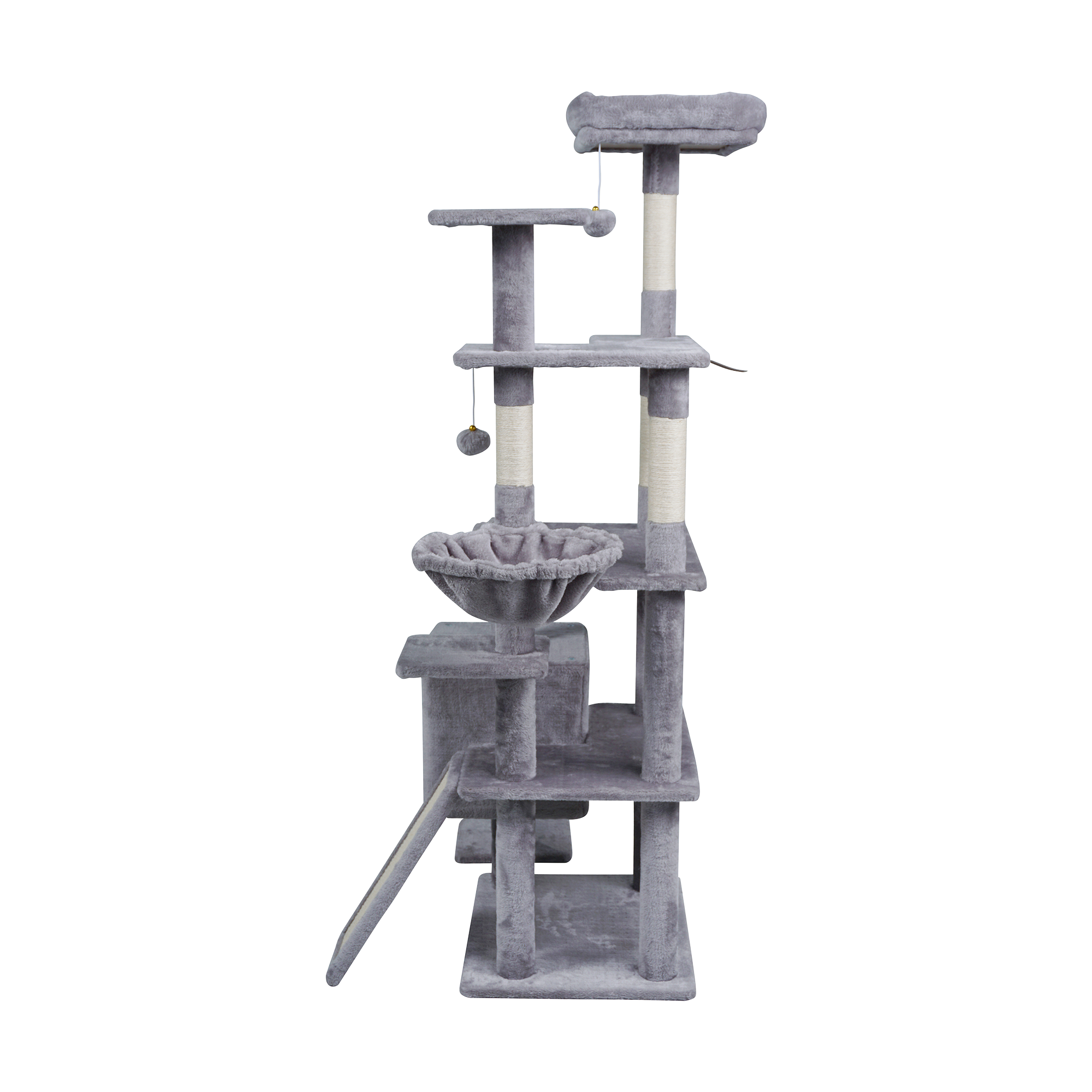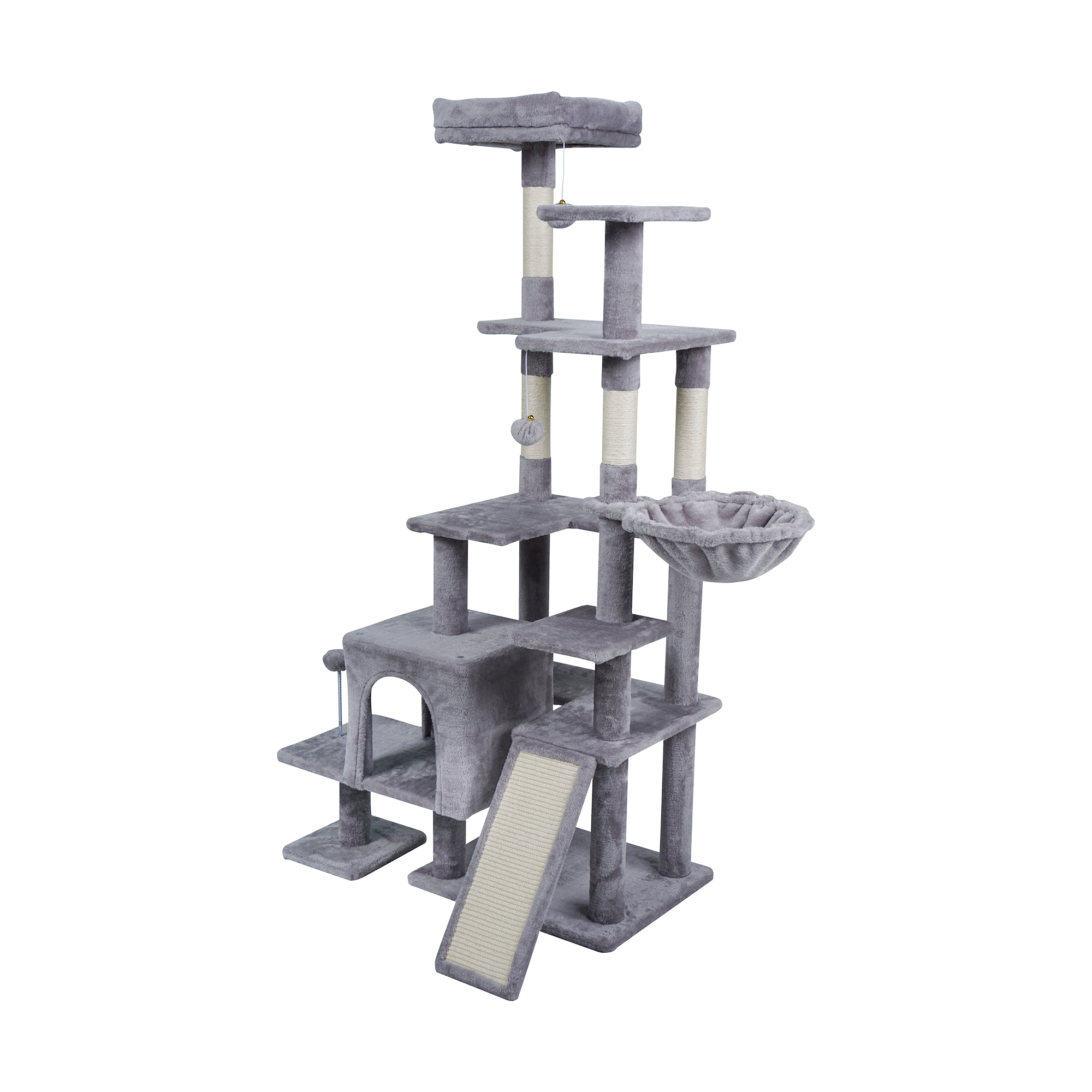 Cztery sizalowe słupki oraz dodatkowa platforma do drapania umożliwiają kotu pielęgnację pazurów i realizację naturalnych instynktów. Trwały sizal jest odporny na zużycie, co zapewnia długotrwałe użytkowanie. To skuteczny sposób na ochronę mebli i zachęcenie kota do aktywności fizycznej.