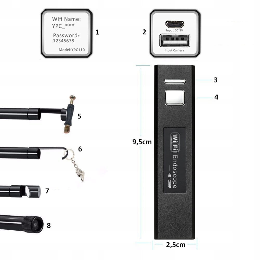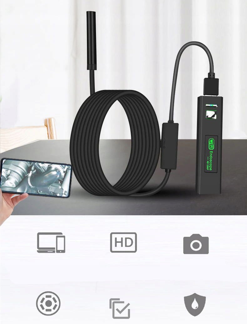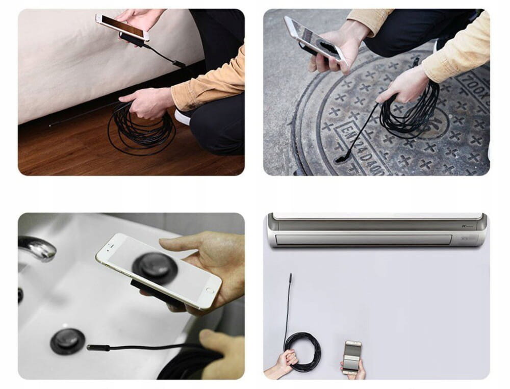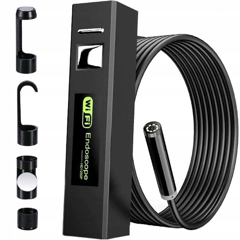 Nowa, innowacyjna kamera endoskopowa w pełni wodoodporna posiadająca 8 diod LED z regulowanym natężeniem światła. Teraz nie musisz podpinać urządzenia poprzez USB w swoim telefonie. Ten wyjątkowy model połączy się z nim i będzie przekazywał obraz za pomocą łącznośći WIFI! Ma bardzo elastyczny i wytrzymały przewód, końcówkę z magnesem, hakiem i lusterkiem. Kamera posiada aż 70 stopniowy kąt widzenia. Teraz filmowanie oraz podgląd na żywo w trudno dostępnych miejscach nie będzie już problemem.