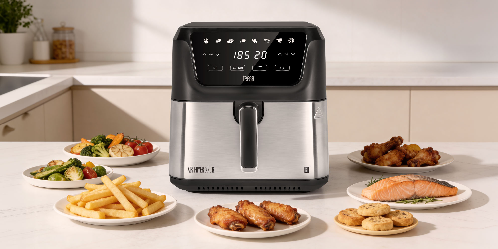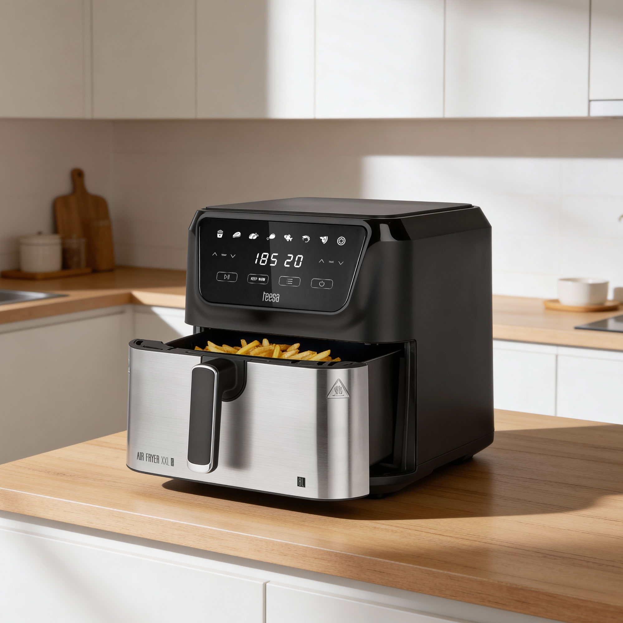 Frytkownica beztłuszczowa Teesa wyposażona jest w intuicyjny panel dotykowy oraz czytelny ekran LCD, dzięki czemu korzystanie z niej jest niezwykle łatwe. Kilka dotknięć wystarczy, aby ustawić odpowiednią temperaturę i czas pieczenia lub wybrać gotowy program. Dodatkowo nowoczesny design doskonale komponuje się z każdym wnętrzem — zarówno klasycznym, jak i nowoczesnym.