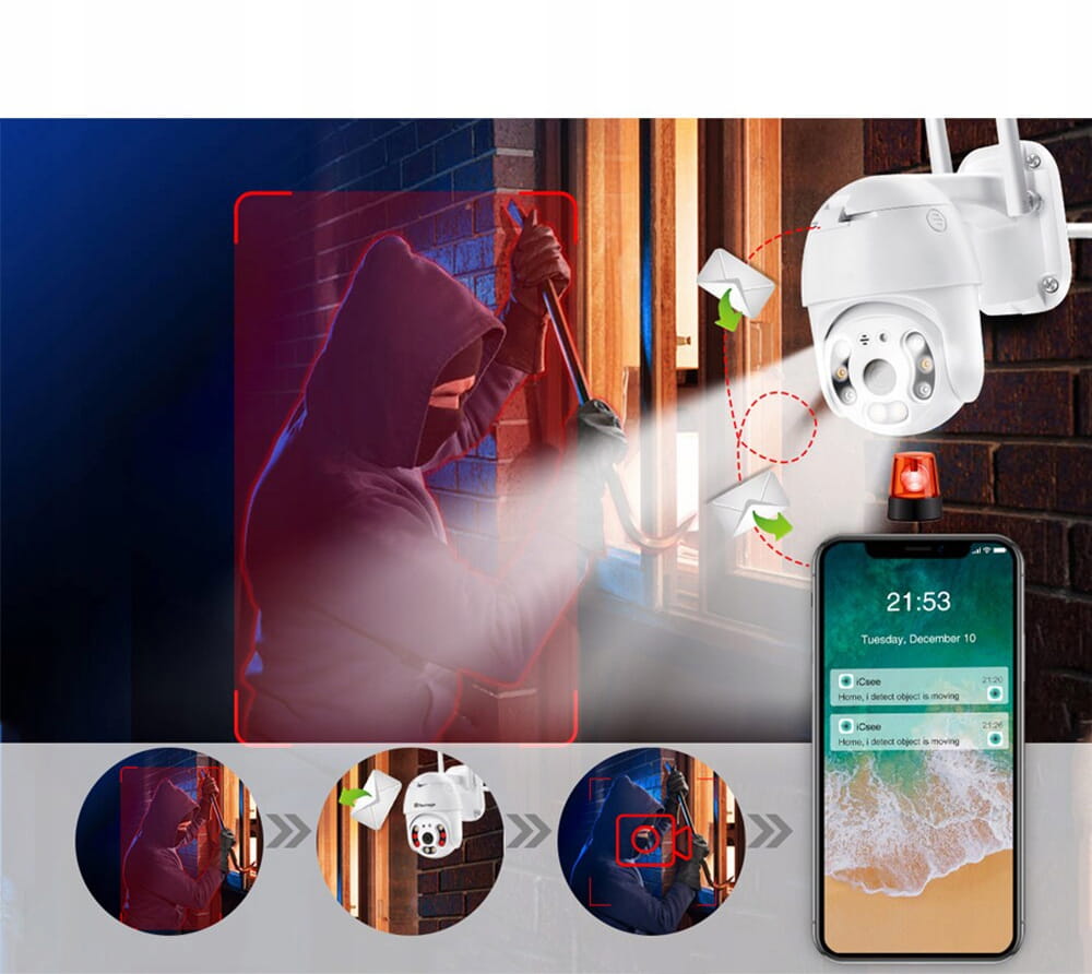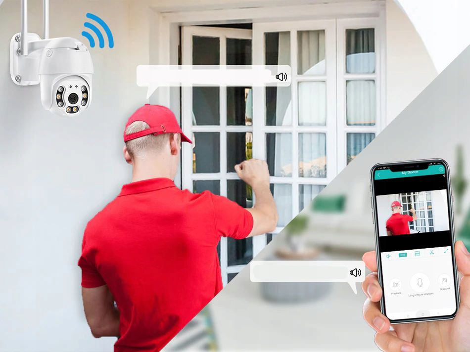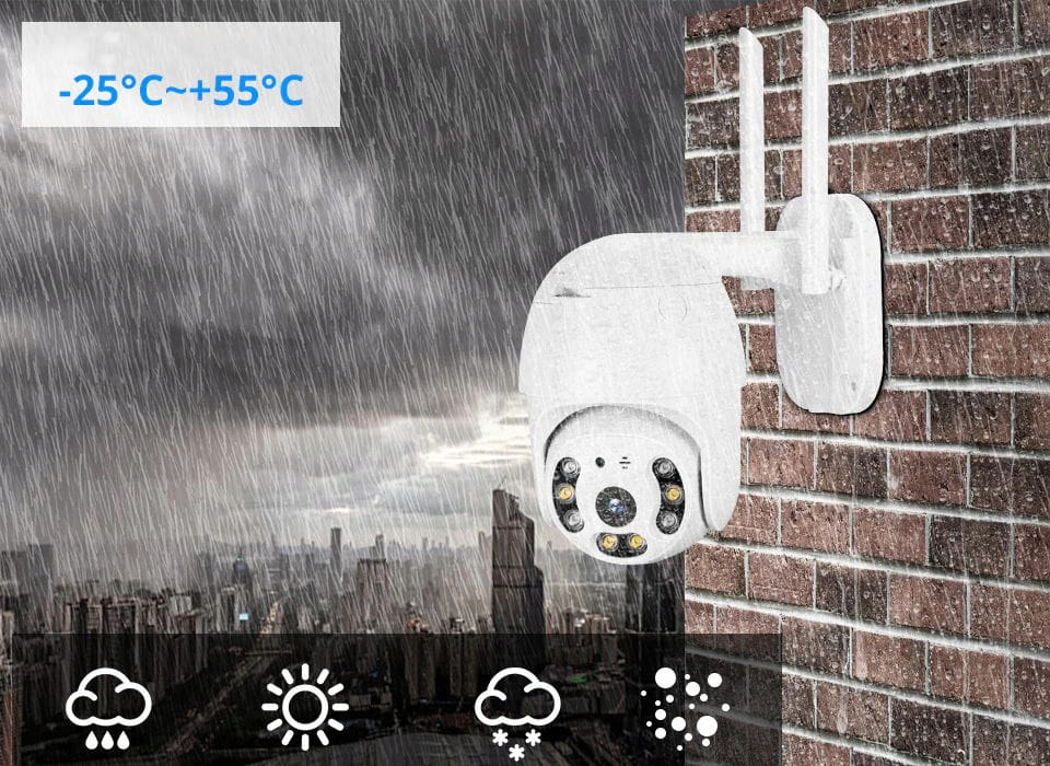 Nasza kamera zewnętrzna, aby sprostać obecnym standardom rynkowym została wyposażona w szereg niezwykle przydatnych funkcji. Należy do nich między innymi komunikacja poprzez Wi-Fi. Dzięki niej użytkownik może w dowolnym momencie sprawdzić obraz rejestrowany przez urządzenie w czasie rzeczywistym. Dodatkowo, funkcja podczerwieni pozwala rejestrować obraz również po zmroku. Urządzenie zostało wyposażone w czujnik ruchu - po sparowaniu kamery z dedykowaną aplikacją, użytkownik otrzyma powiadomienie o wykryciu ruchu na swój telefon w dowolnym miejscu. Kamera może również śledzić ruch obiektu znajdującego się w polu jej wiedzenia.