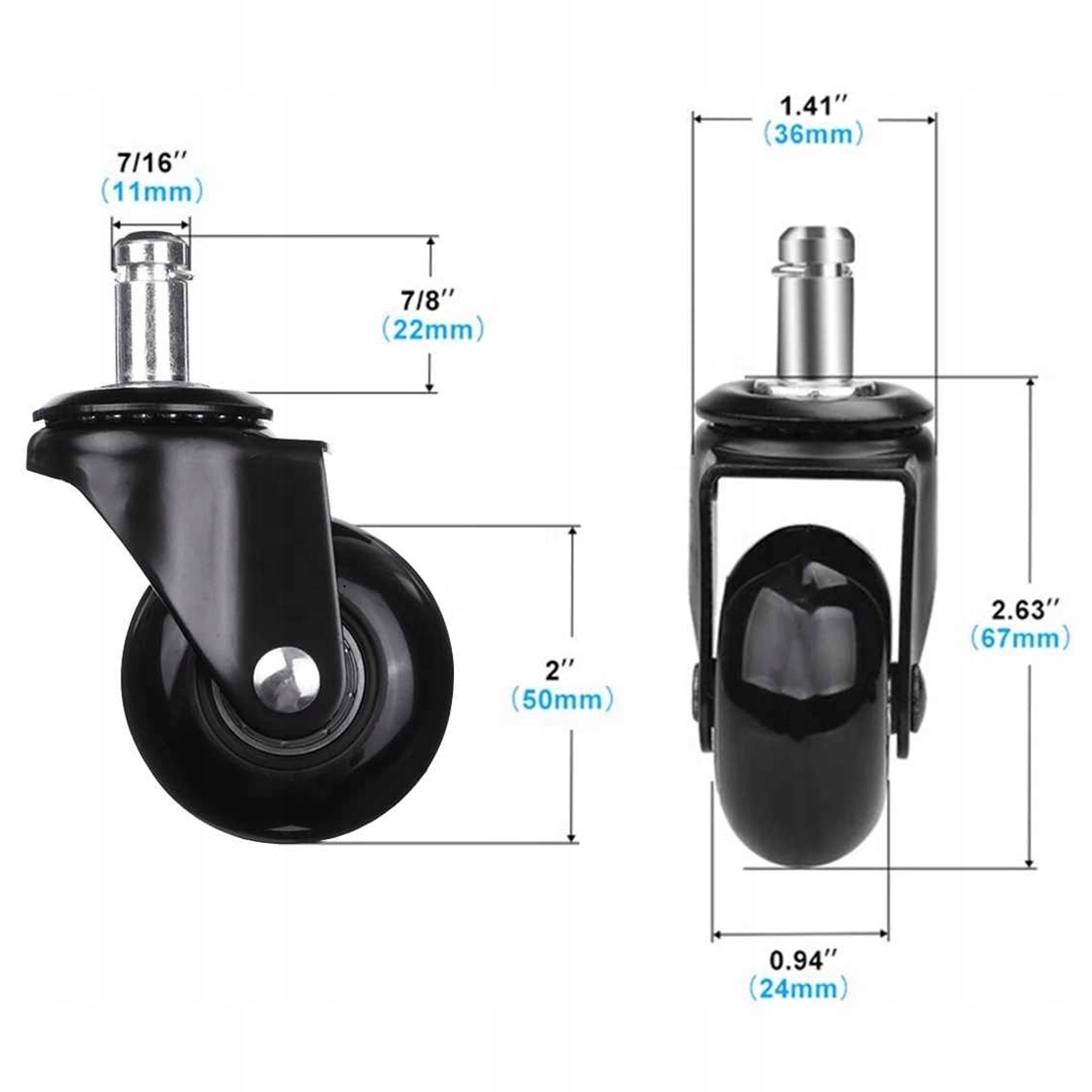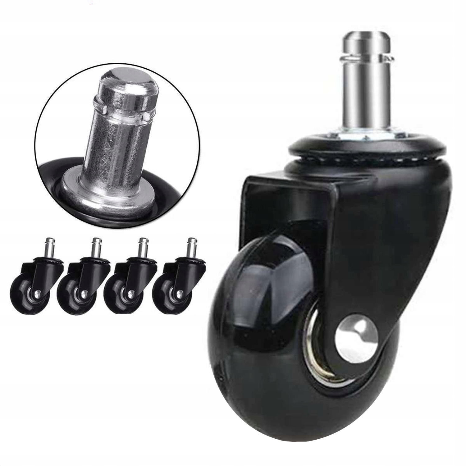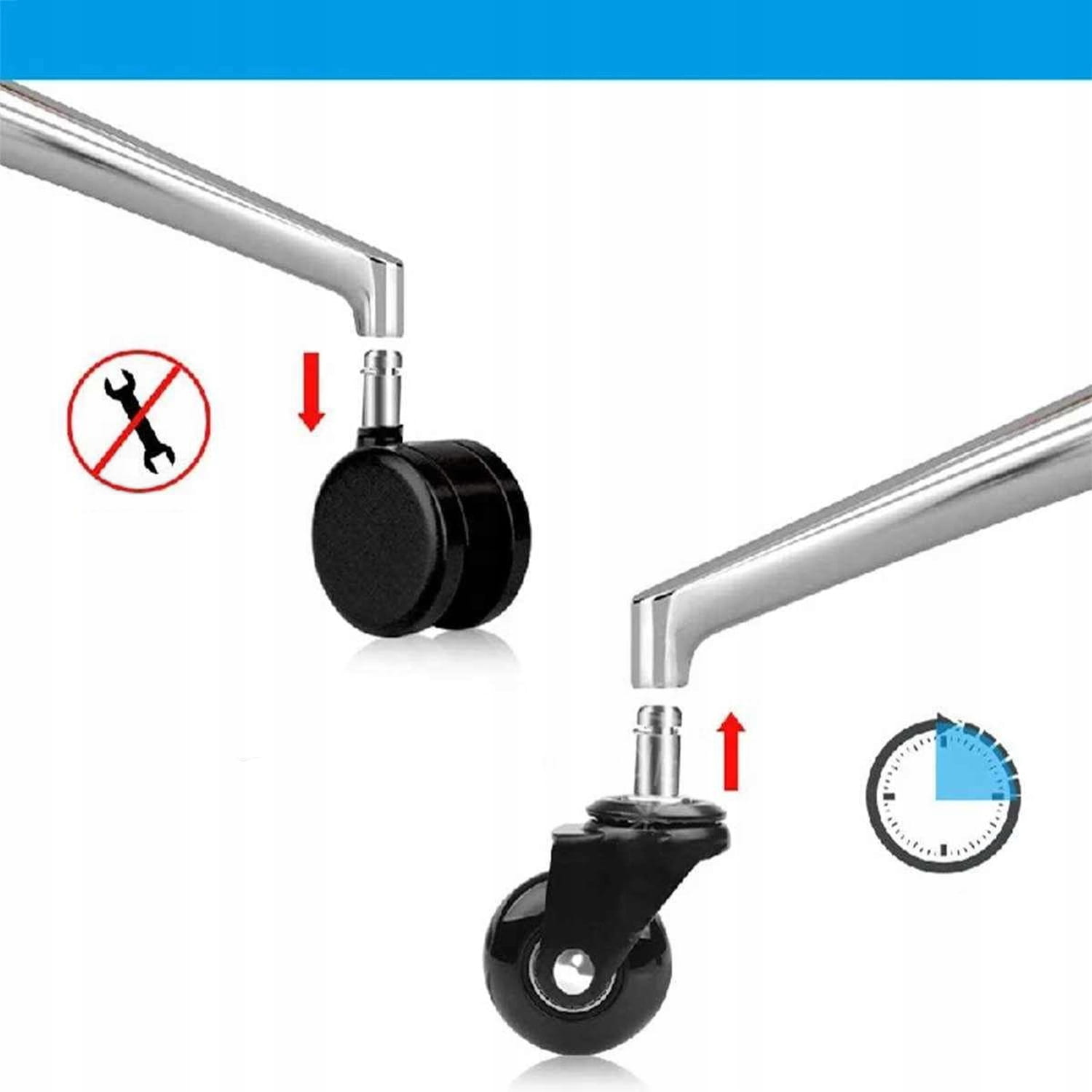 Kółka oferowane na naszej aukcji zamontujesz w dowolnym fotelu lub krześle w zaledwie 2 minuty! Produkt posiada uniwersalny trzpień o wymiarach 22×11 mm dzięki czemu pasuje do większości dostępnych na rynku mebli. W celu zamocowania kółka wystarczy że wciśniesz je na miejsc, tak jak pokazano na rysunku. Bez narzędzi i bałaganu!
