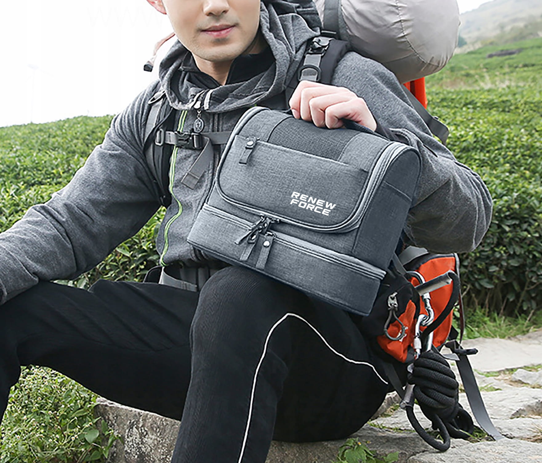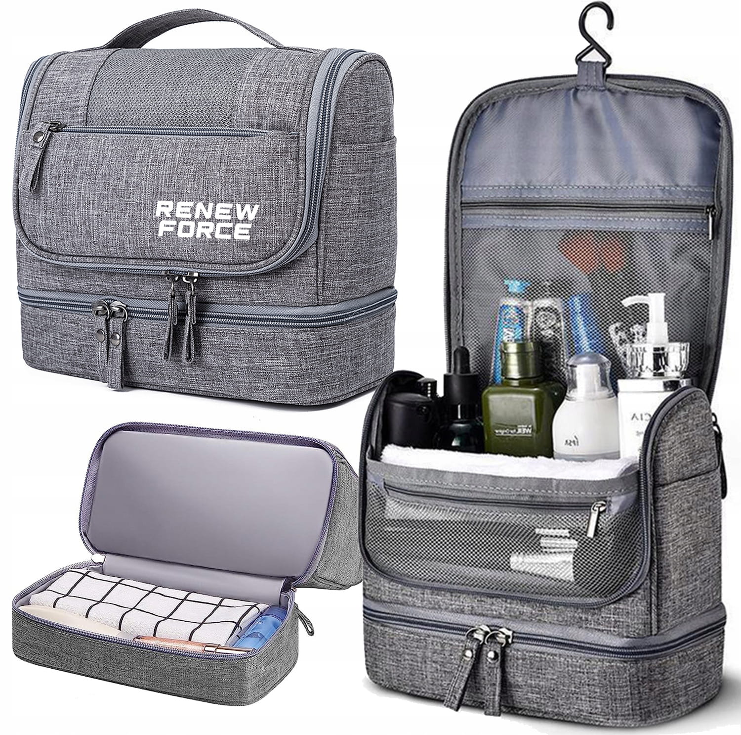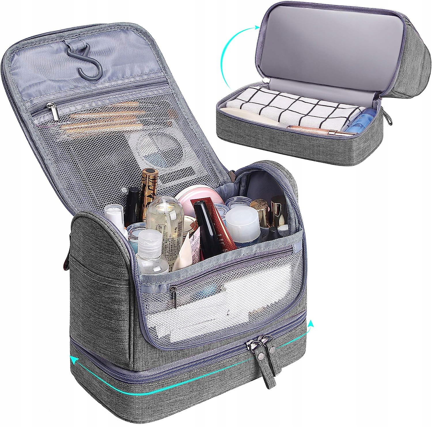 - Oddzielna kieszeń na dnie kosmetyczki, idealna na ręcznik lub produkty wymagające dodatkowej ochrony.