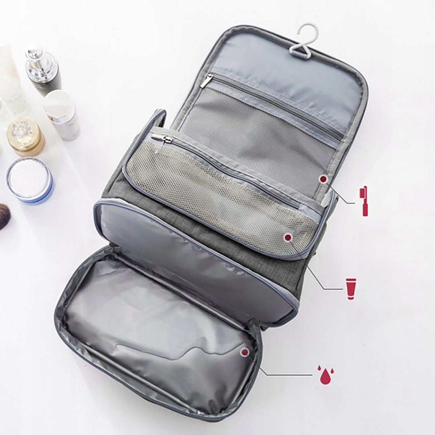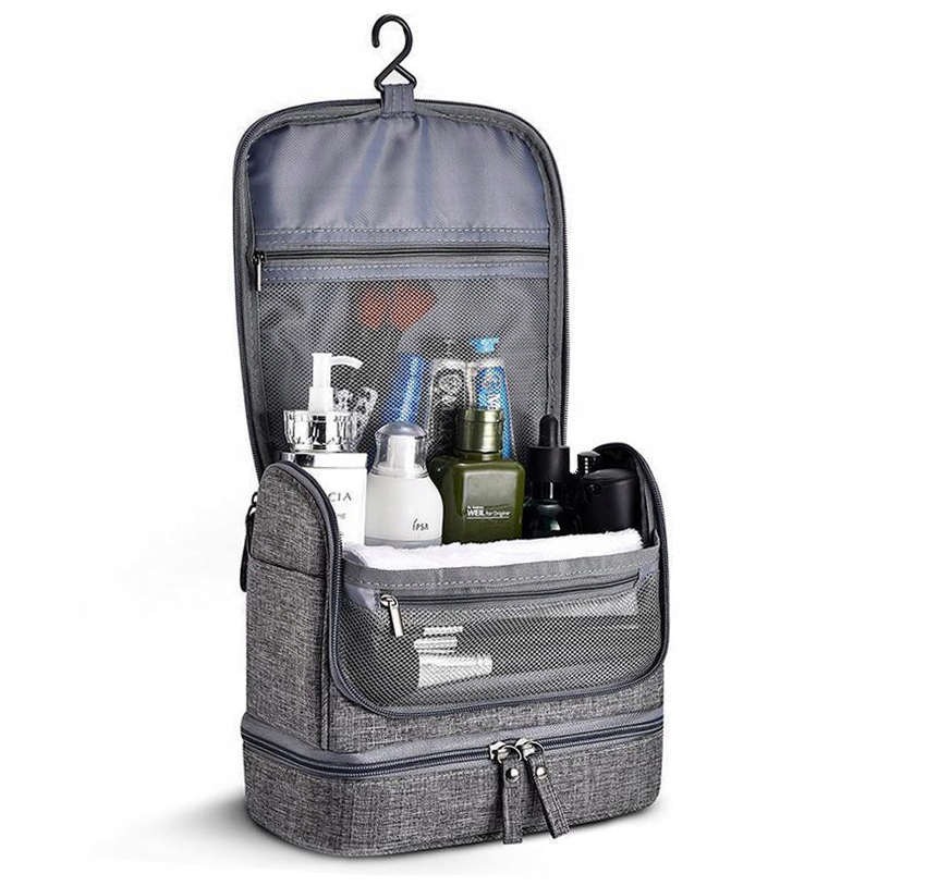 - Wyposażona w haczyk, który umożliwia zawieszenie kosmetyczki w łazience lub na drzwiach, zapewniając maksymalną wygodę.
