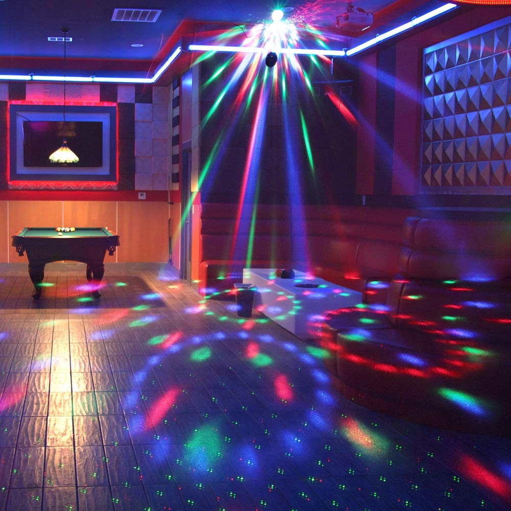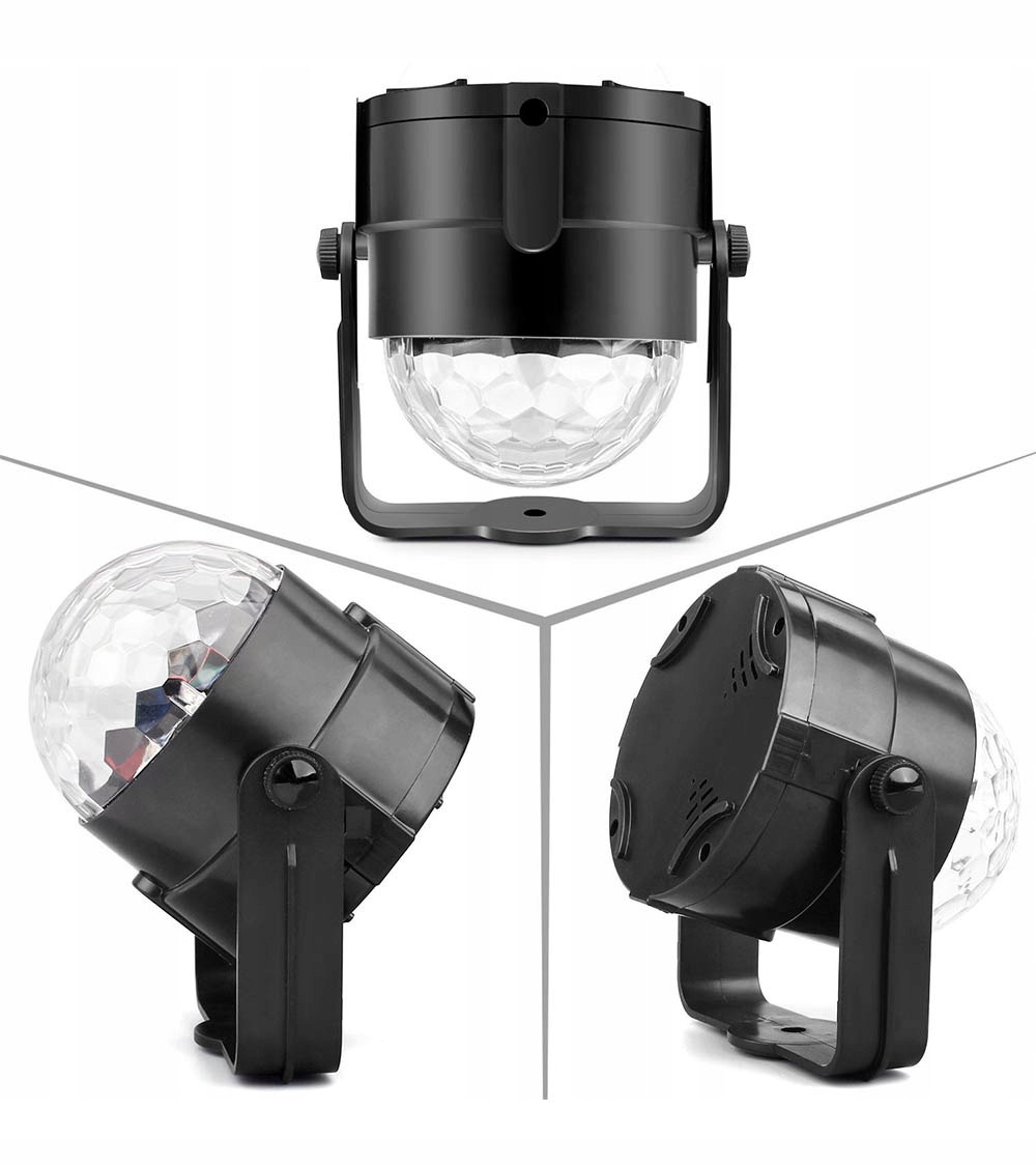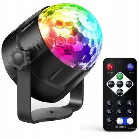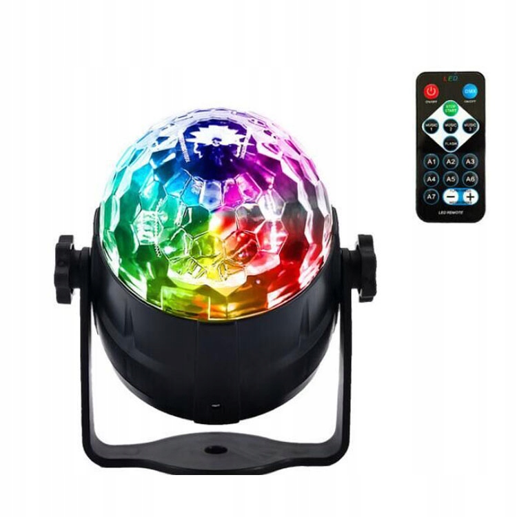 Po odtworzeniu muzyki kula włączy automatyczny program świetlny, możesz go jednak łatwo zmienić również zdalnie, przy pomocy dołączonego do zestawu pilota. Kolory oświetlenia to czerwony, biały, niebieski, żółty, zielony, fioletowy. Lampa posiada specjalne otwory dzięki, którym można ją zamontować na ścianie lub suficie.