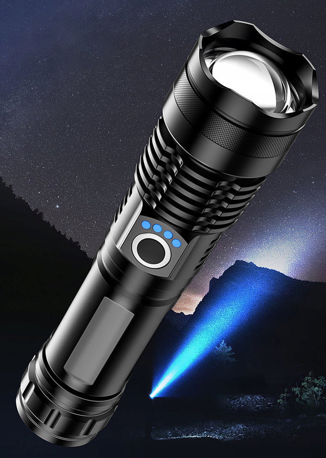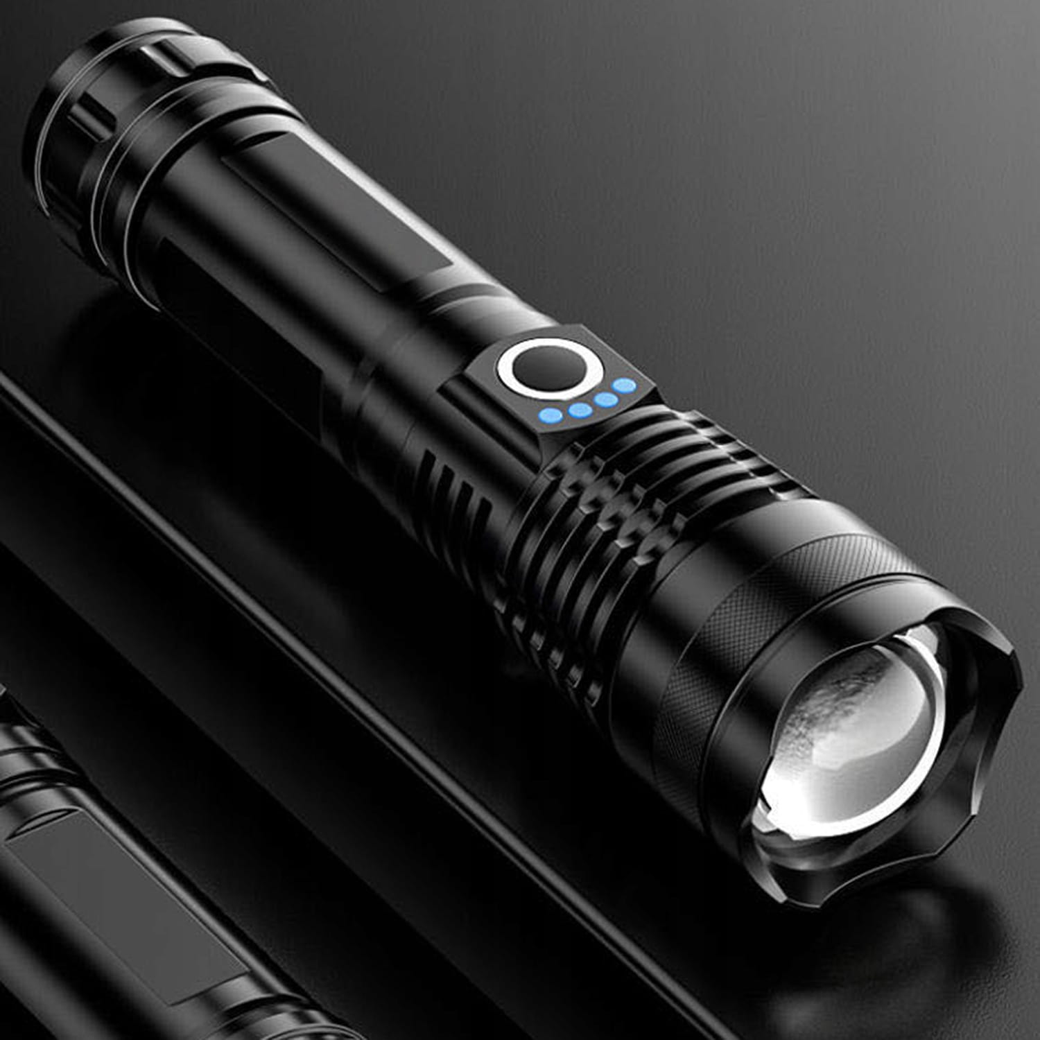 Nasza latarka posiada wskaźnik naładowania w postaci 4 niebieskich świecących diod nad włącznikiem, byś zawsze wiedział ile baterii masz w latarce!