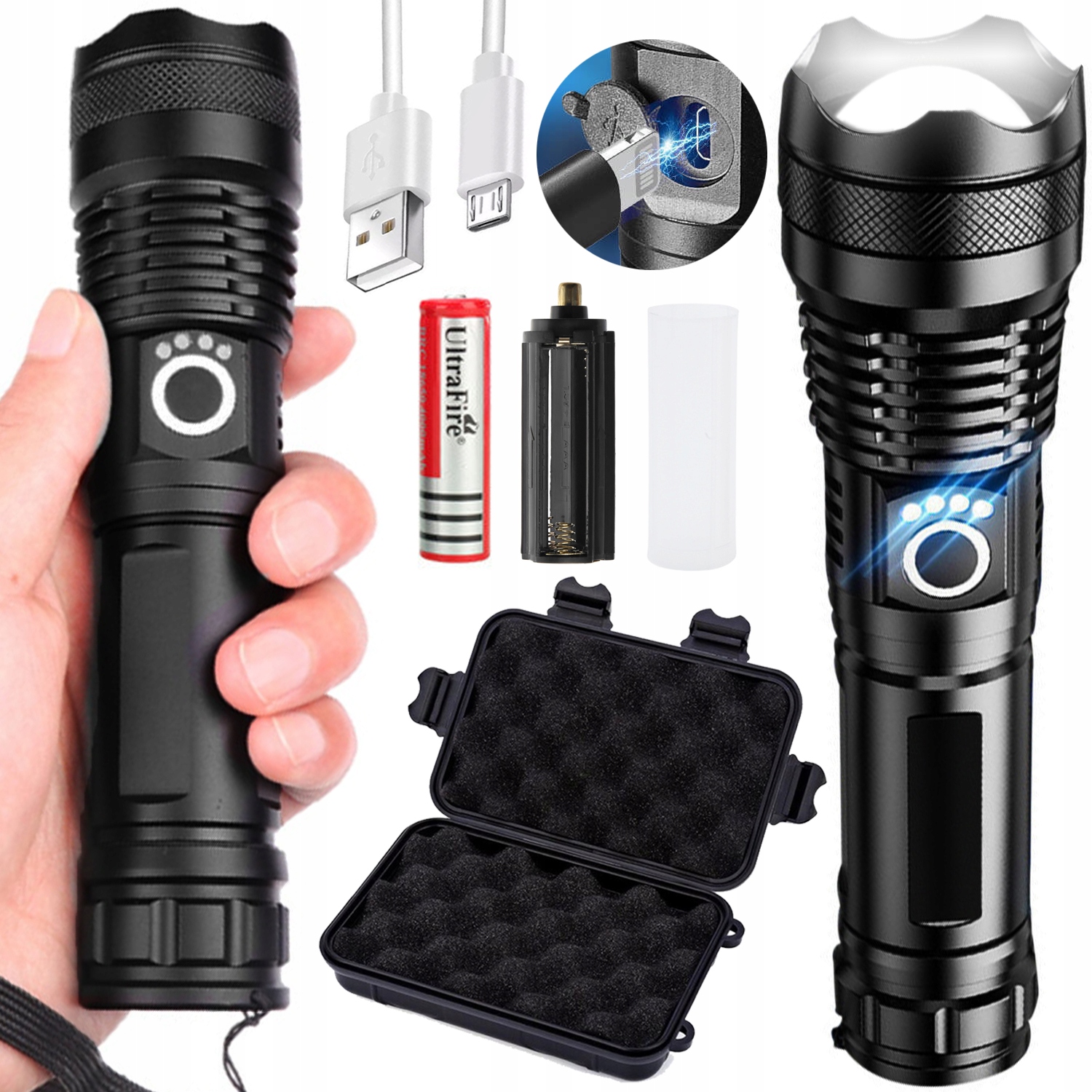 - Rozładowaną latarkę z łatwością naładujesz poprzez dołączony do zestawu przewód USB.