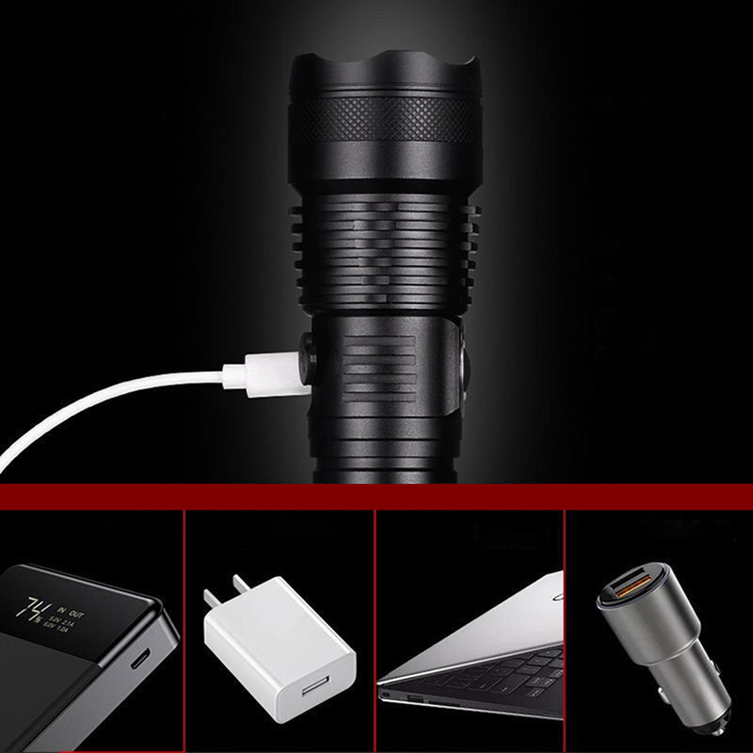 - Akumulatorowa latarka jest zasilana przez akumulator, który można ładować za pomocą zwykłego gniazdka lub USB.