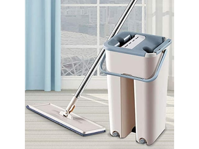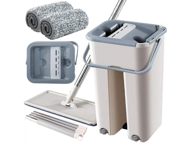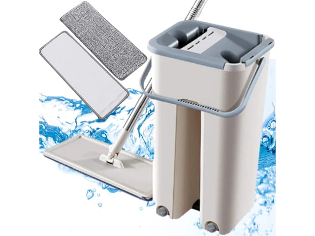 Posiada wiaderko dwukomorowe na czystą i brudną wodę.