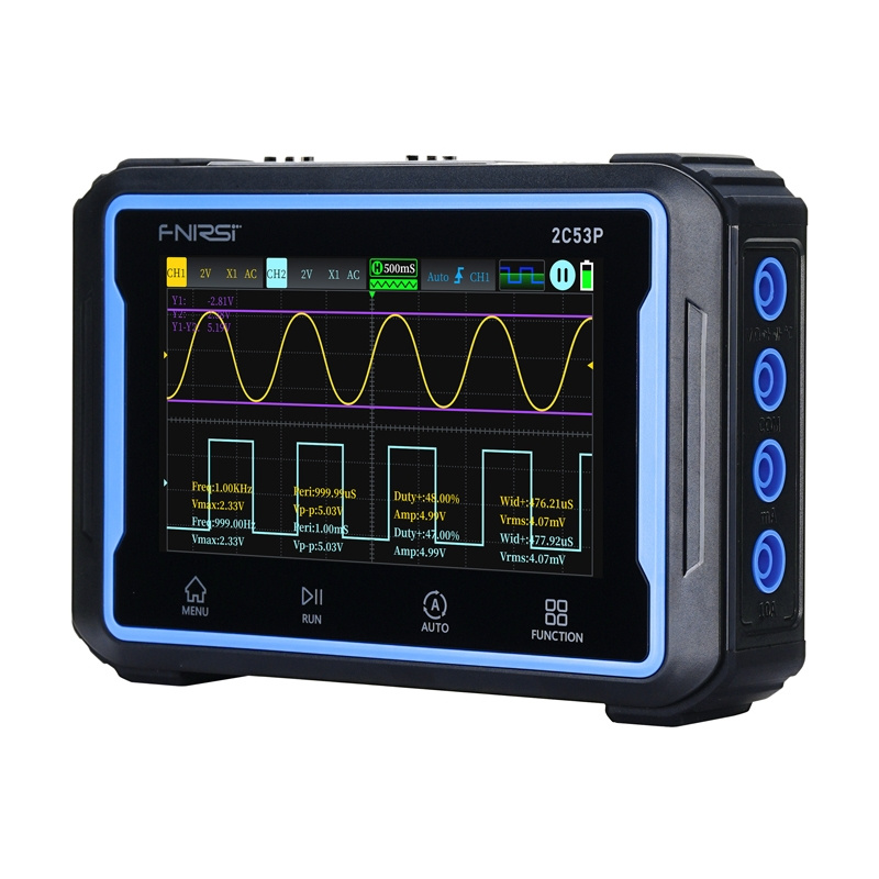 FNIRSI 2C53P to przenośny oscyloskop, który łączy w sobie trzy funkcje: oscyloskop dwukanałowy, multimetr cyfrowy oraz generator DDS. Urządzenie oferuje szeroką funkcjonalność w kompaktowej formie. Wyposażone jest w dotykowy ekran IPS o przekątnej 4,3 cala i rozdzielczości 480 × 272 pikseli, który zapewnia intuicyjną obsługę i swobodne przeglądanie przebiegów z możliwością ich powiększania i przesuwania. Oscyloskop oferuje pasmo 50 MHz, próbkowanie z częstotliwością 250 MSa/s oraz 12 przełączanych form przebiegów. Dzięki temu nadaje się idealnie do pomiarów napięcia, prądu, rezystancji, pojemności czy temperatury z precyzją aż do 19999 odczytów.