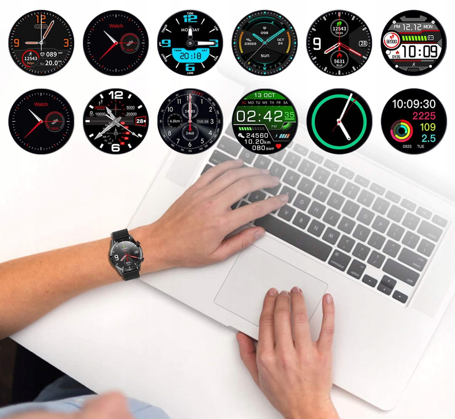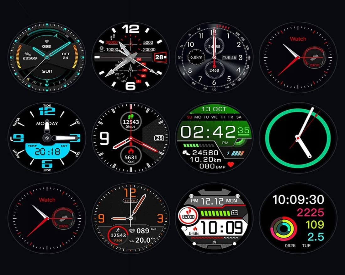 Z poziomu aplikacji zegarka możemy wybrać jedną z wielu różnorodnych tarcz, które mogą się wyświetlać na ekranie. Styl tarczy możemy dostosować względem swojego aktualnego nastroju, pory dnia lub danej okazji. Podczas spotkania biznesowego można wybrać bardziej oficjalny styl z analogowym zegarem, natomiast na popołudniowy rozruch fizyczny możemy zmienić tarczę na bardziej sportowo-elektroniczny styl. Wszystko zależy od Ciebie!