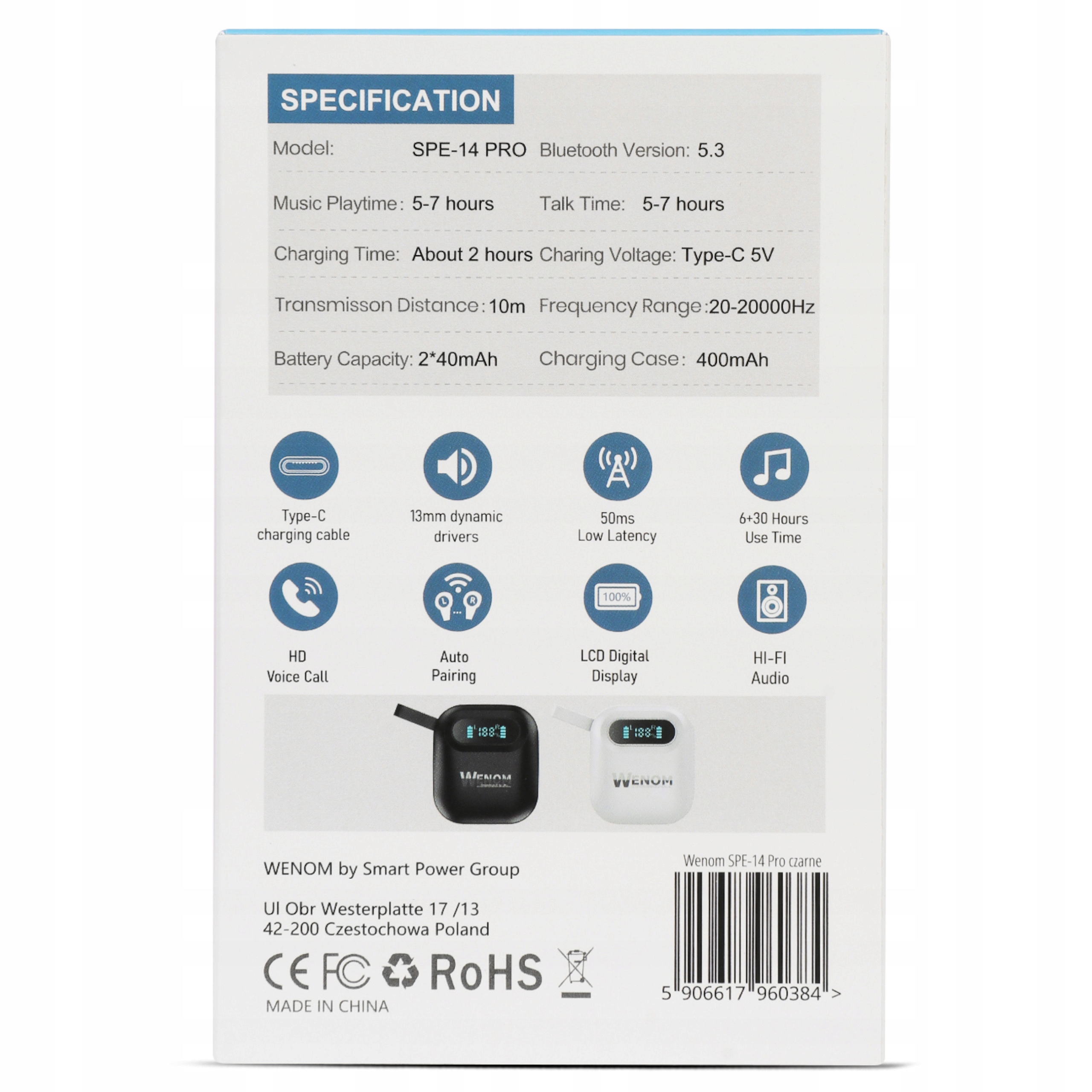 Poznaj bezprzewodowe słuchawki Bluetooth 5.3 Wenom SPE-14 PRO – idealne połączenie nowoczesnej technologii i doskonałego dźwięku! Wyposażone w zaawansowany chipset JL6973, zapewniają stabilne połączenie, długi czas pracy na baterii i czyste brzmienie. Niezależnie od tego, czy korzystasz z urządzeń iOS czy Android, słuchawki Wenom SPE-14 PRO dostarczą Ci niezapomnianych wrażeń muzycznych i komfortu podczas rozmów.