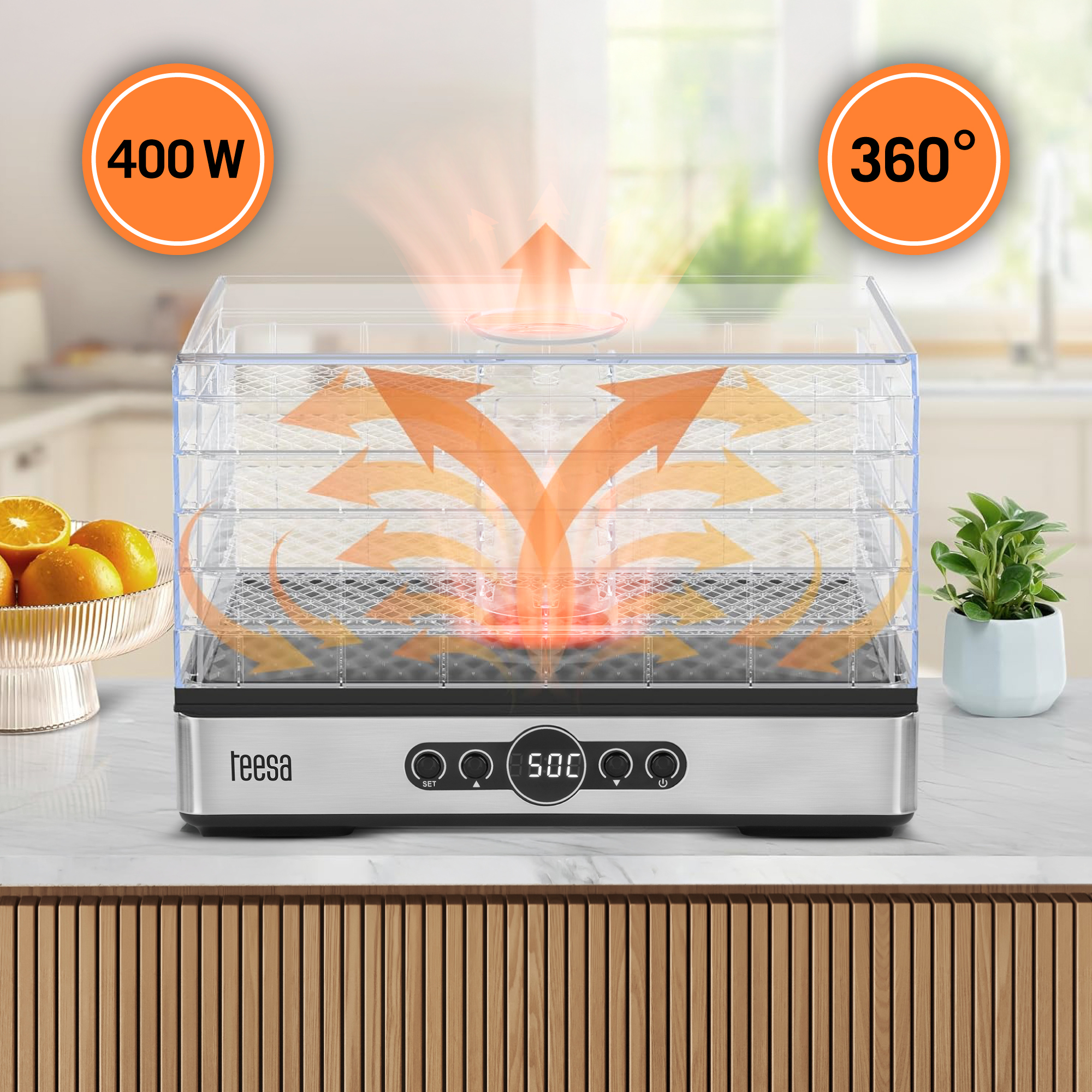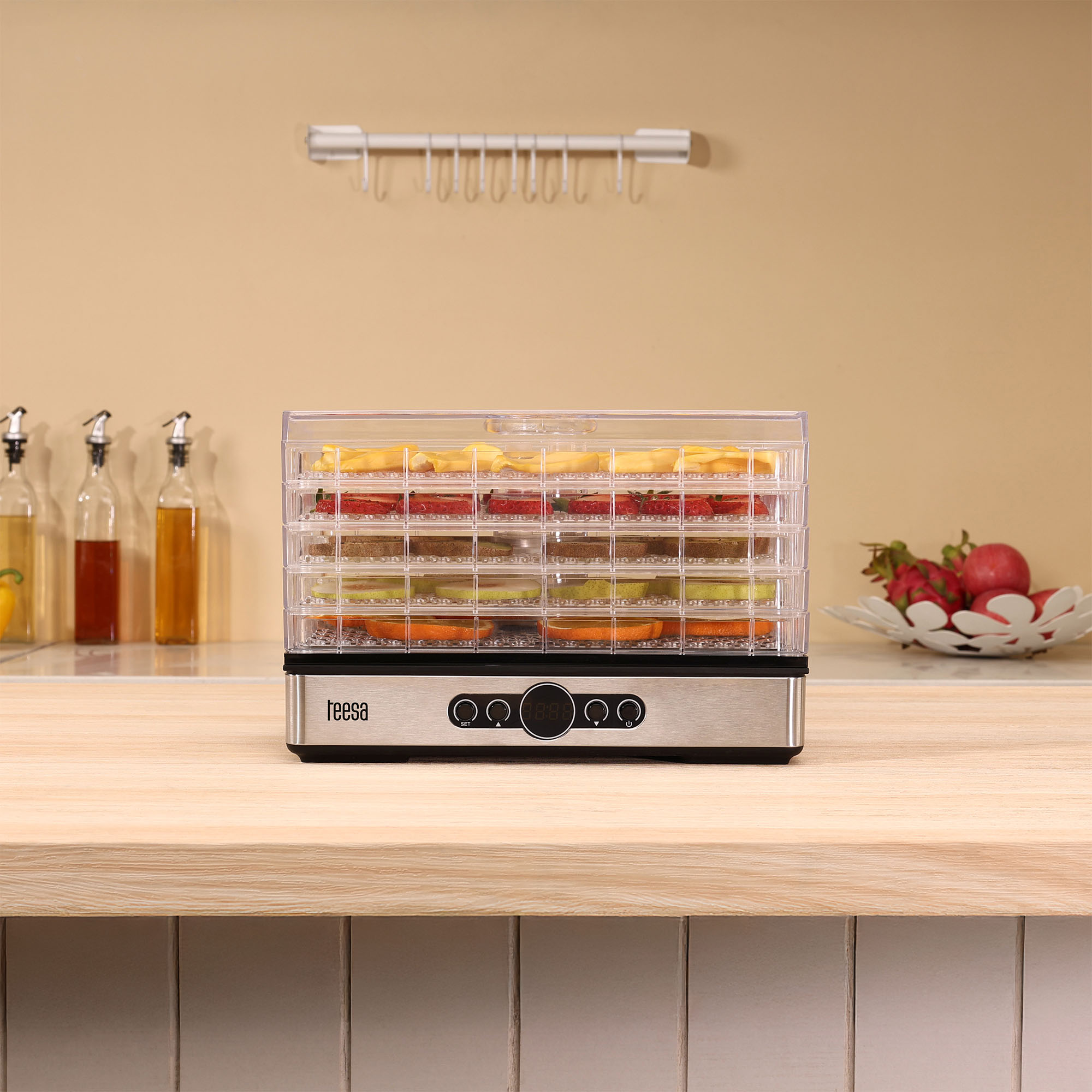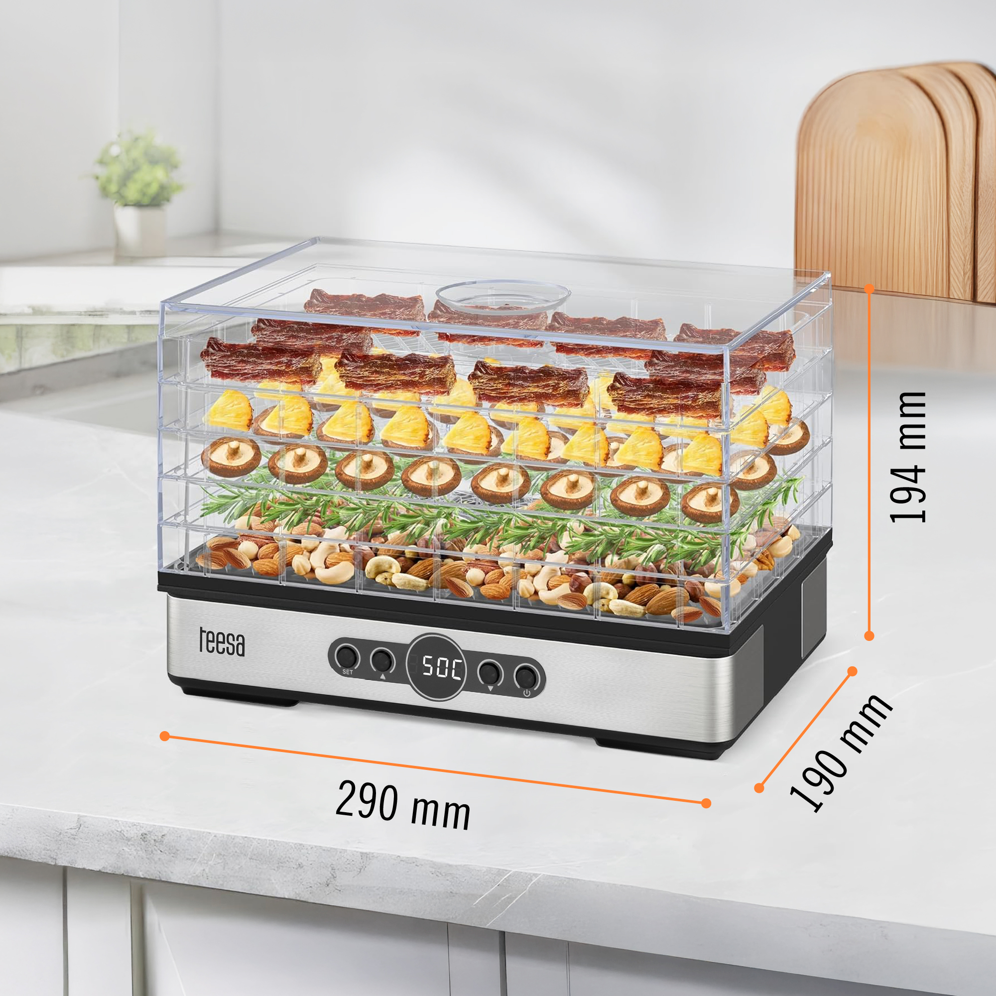 Suszarka Teesa oferuje aż 5 dużych, przezroczystych sit, które pomieszczą łącznie do 1,7 kg produktów. Przezroczyste tace umożliwiają kontrolę suszenia bez konieczności otwierania urządzenia, co zapewnia stałą temperaturę i efektywność.