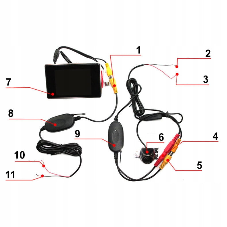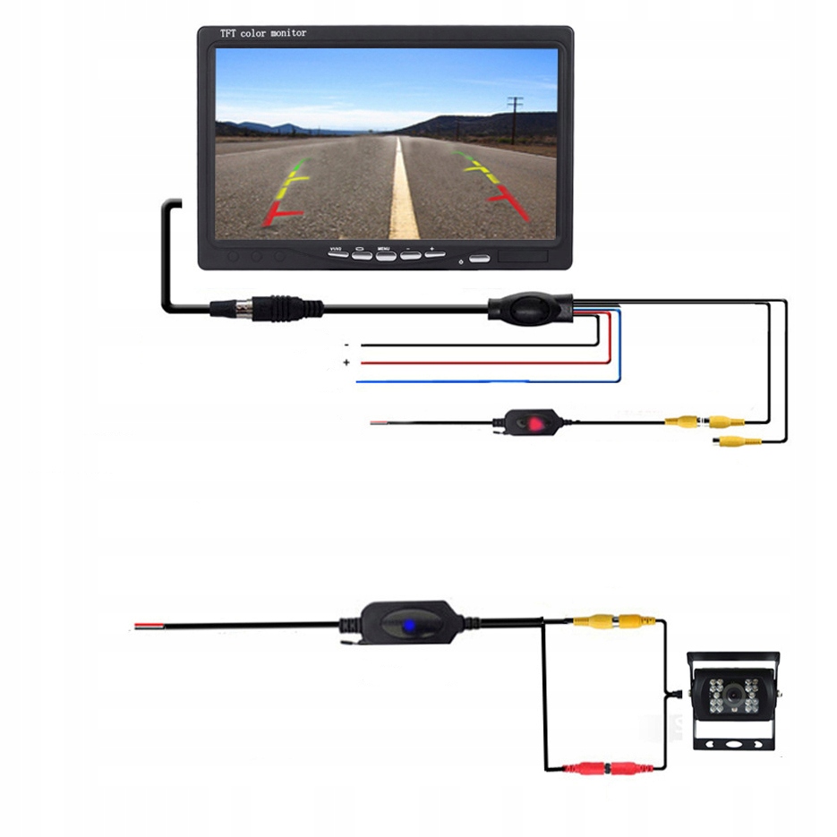 - Rodzaj wtyków do przesyłania obrazu: RCA (cinch) + dodatkowe złącze zasilające monitor