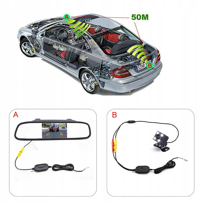 Nadajnik i odbiornik wykorzystują częstotliwości radiowe 2,4 GHz i bezprzewodowo przekazują sygnał video przechwycony przez kamerę cofania do dowolnego rejestratora. W optymalnych warunkach (bez zakłóceń) sygnał może być przesyłany na odległość nawet 50 metrów. Wykorzystanie bezprzewodowego transmitera ułatwia montaż kamery cofania i sprawia, że nie jest konieczne ciągnięcie przez wnętrze pojazdu dodatkowego okablowania.