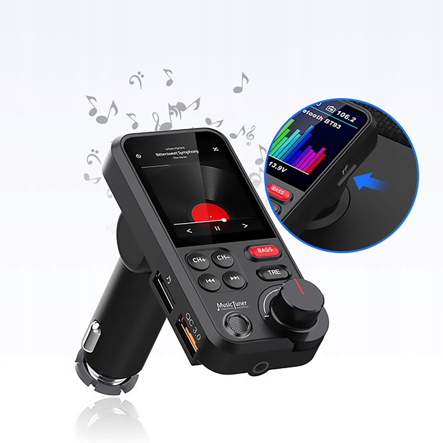 Transmiter FM odtwarza muzykę z telefonu poprzez moduł Bluetooth 5.0 a także z pendrivea czy karty SD. Aby rozpocząć odtwarzanie wystarczy podpiąć transmiter do gniazda zapalniczki samochodowej i dostroić radio do częstotliwości wyświetlonej na wyświetlaczu LCD. W przypadku połączeń przychodzących, transmiter automatycznie przejdzie z odtwarzania muzyki do rozmów telefonicznych. Po zainstalowaniu w transmiterze karty SD lub podpięciu do jednego z jego portów USB pendrive'a urządzenie automatycznie przełączy się w odpowiedni tryb odtwarzania.