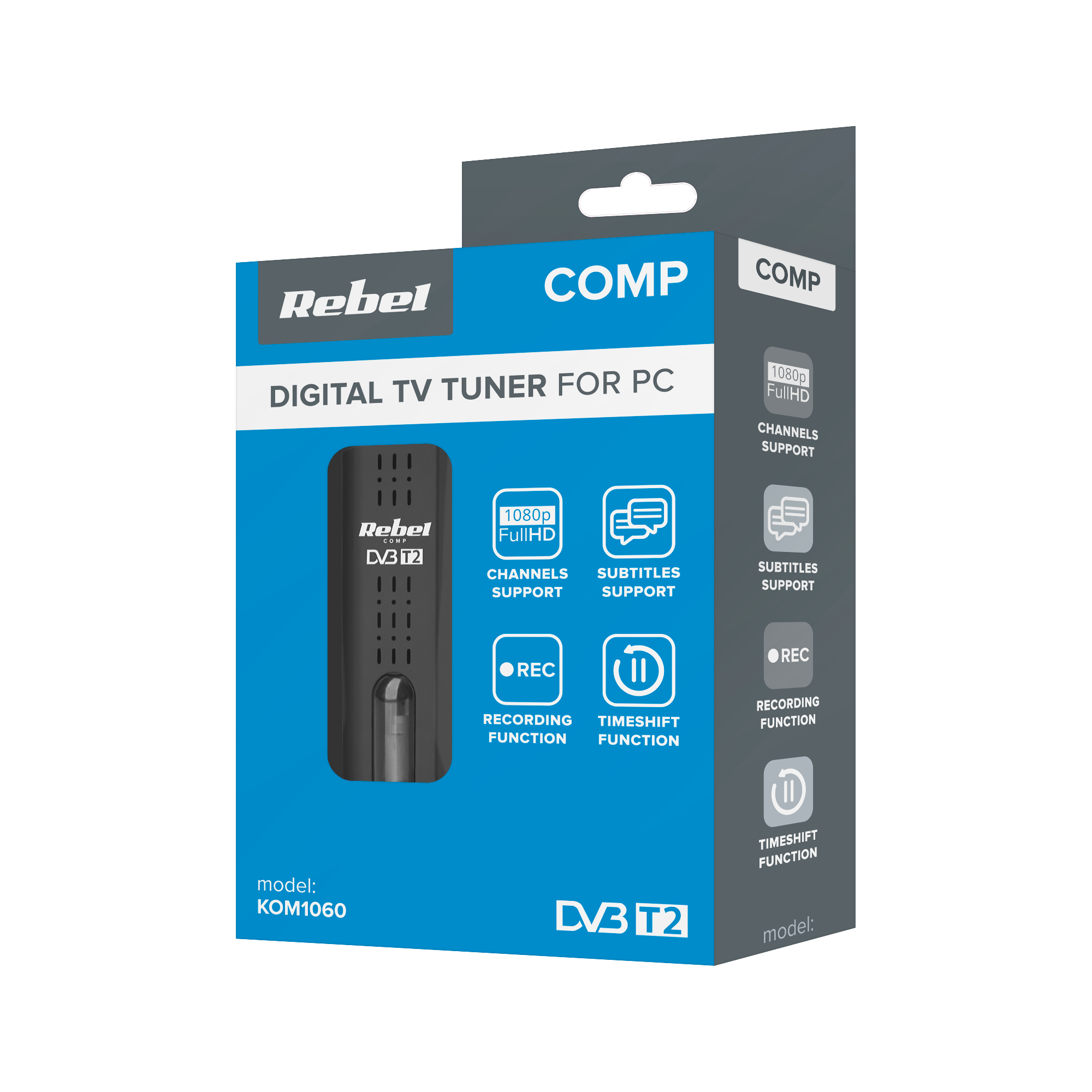 Tuner DVB-T do laptopa Rebel charakteryzujące się dużą czułością na sygnał oraz umożliwia dostosowanie jasności, kontrastu, nasycenia obrazu. Urządzenie posiada także wiele rozbudowanych funkcji m.in. obsługę napisów, teletekstu, zatrzymanie kanału transmitowanego na żywo (Time Shift), obsługę nagrywania i przechwytywanie wideo w czasie rzeczywistym. Dodatkowo tuner odtwarza dźwięk stereo oraz umożliwia słuchanie radia w standardzie FM, DAB, VHF i UHF.