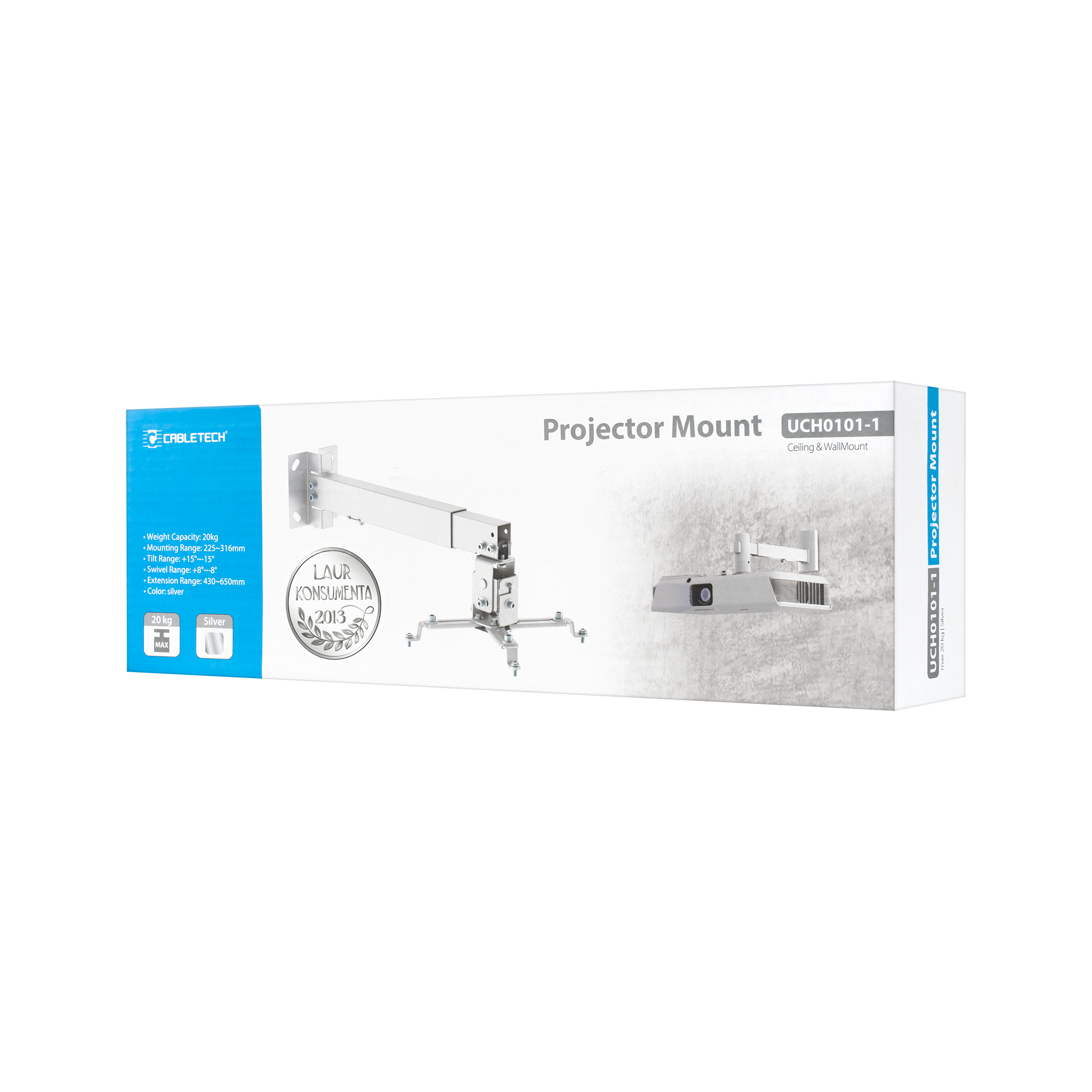 Wykonany ze stali, wyróżnia się trwałością, utrzymując maksymalne obciążenie do 20 kg. Eleganckie, srebrne wykończenie, uzyskane dzięki malowaniu proszkowo, nadaje mu nowoczesny i stylowy wygląd, który doskonale komponuje się z różnorodnymi aranżacjami wnętrz. Dodatkowo, wbudowany system zarządzania kablami zapewnia schludność i porządek wokół projektora, poprawiając estetykę całego pomieszczenia.