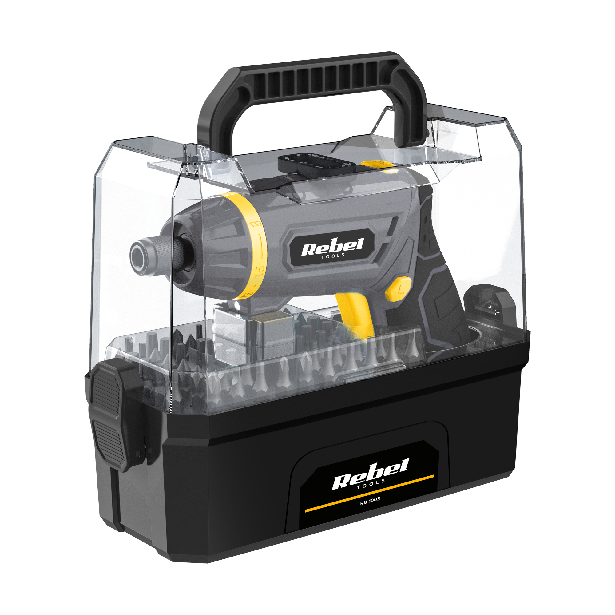 W zestawie z wkrętarką Rebel Tools otrzymujesz kasetkę do przechowywania bitów, która umożliwia zachowanie porządku i łatwy dostęp do akcesoriów, zawsze gdy ich potrzebujesz.