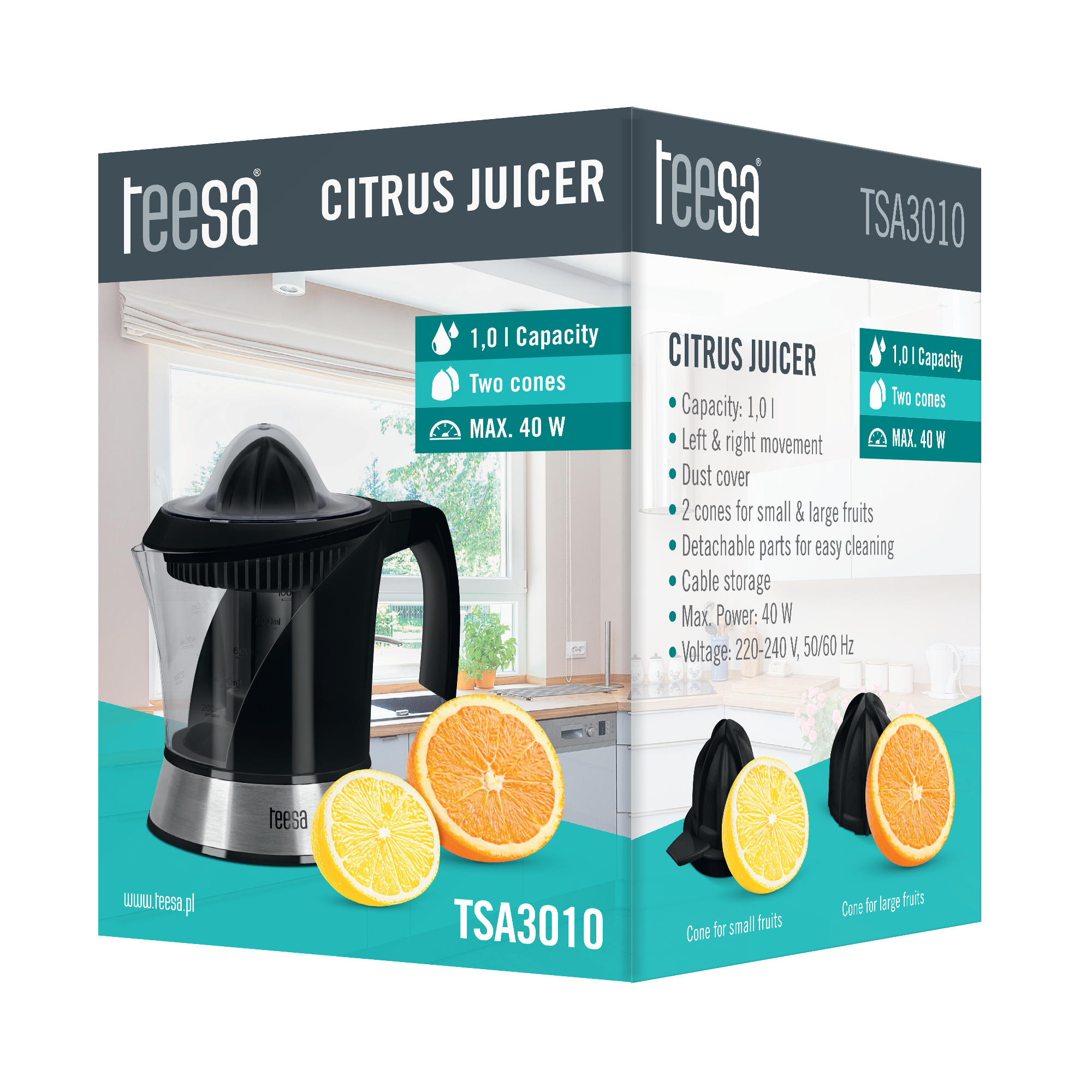 Czarna obudowa, wykończona elementami szczotkowanej stali nierdzewnej oraz przezroczysta strefa na sok sprawią, że wyciskarka Teesa będzie nie tylko praktycznym urządzeniem kuchennym, ale również eleganckim elementem wystroju. Dzięki pokrywie chroniącej przed kurzem oraz wyjmowanym częściom, które ułatwiają mycie, można w bardzo łatwy sposób zachować czystość urządzenia.
