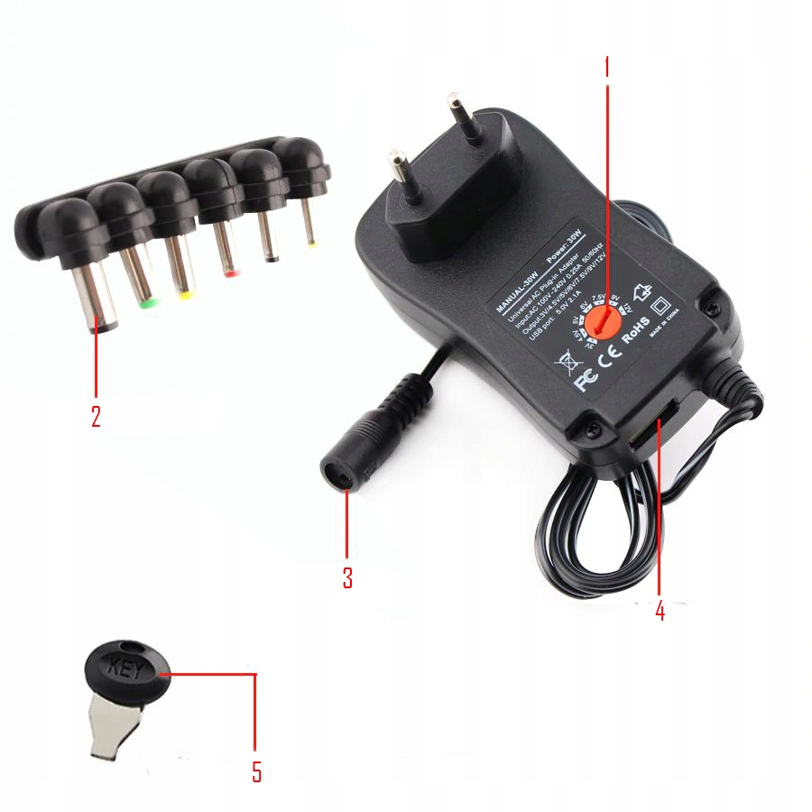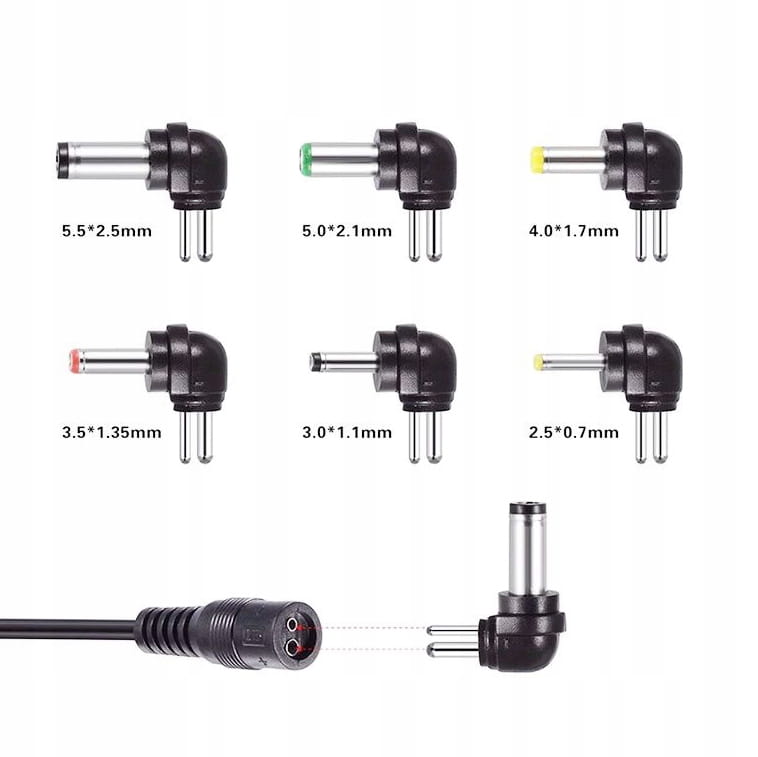 Ten zestaw z 6 zmiennymi końcówkami umożliwia podłączenie do wielu różnych urządzeń, co czyni go bardzo wszechstronnym. Dzięki temu użytkownik nie musi kupować oddzielnych zasilaczy do każdego z urządzeń, co pozwala zaoszczędzić czas i pieniądze.
