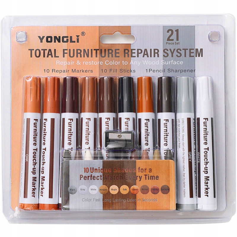 Zestaw markerów i półtwardych wosków do samodzielnej naprawy mebli drewnianych, podłóg, paneli, schodów, futryn i wielu innych. Zestaw pozwala zniwelować niewielkie odpryski na elementach mebli i podłóg nienarażonych na znaczną eksploatację.