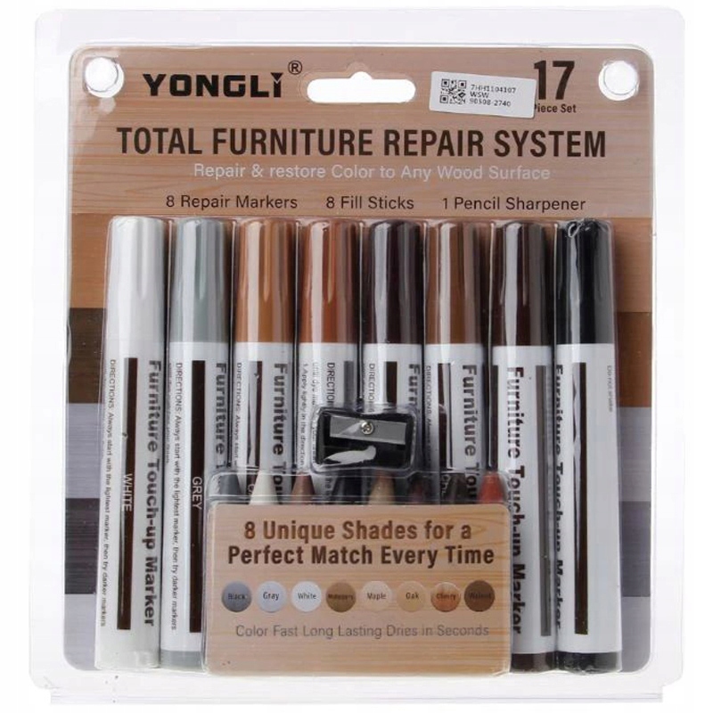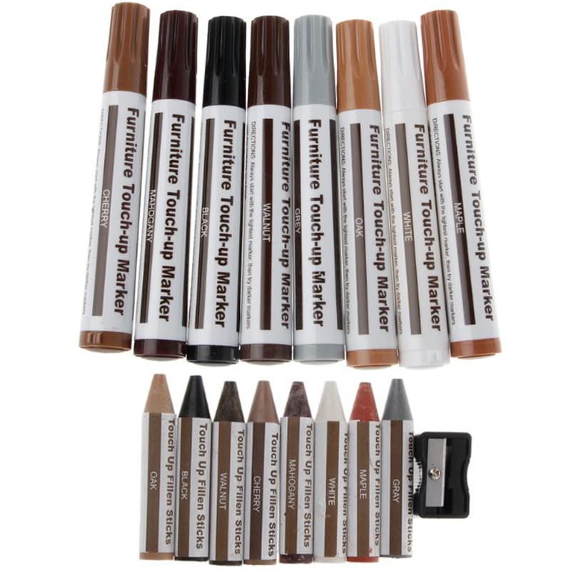 Zestaw markerów i półtwardych wosków do samodzielnej naprawy mebli drewnianych, podłóg, paneli, schodów, futryn i wielu innych. Zestaw pozwala zniwelować niewielkie odpryski na elementach mebli i podłóg nienarażonych na znaczną eksploatację.