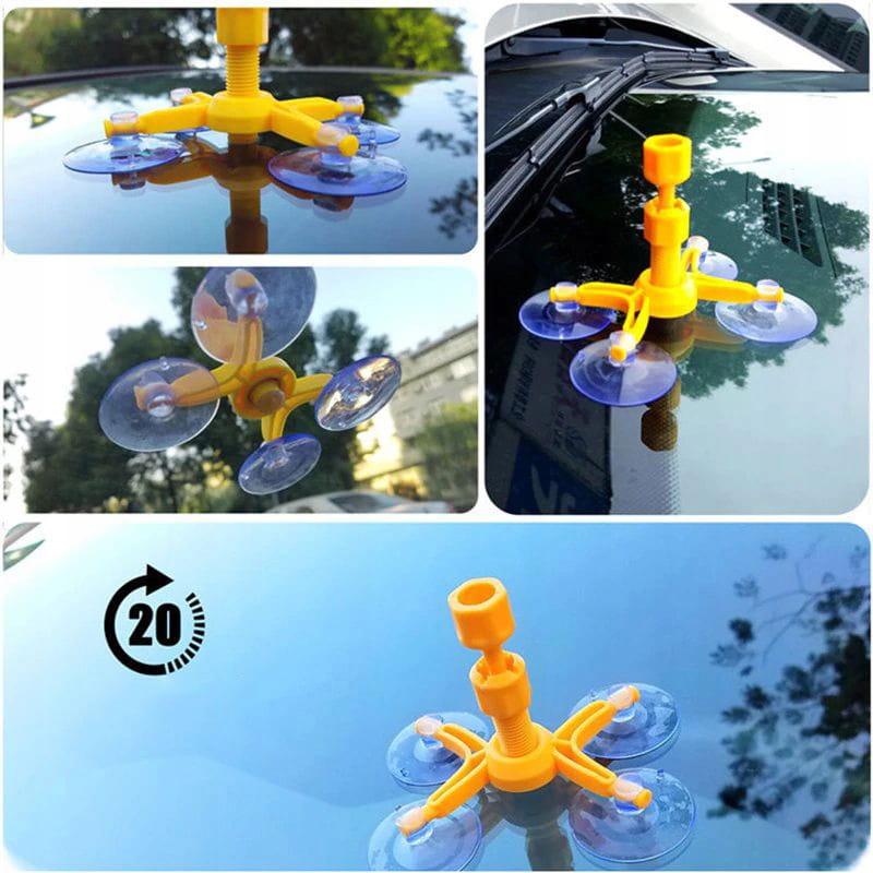 - Po całkowitym usunięciu powietrza z naprawianego ubytku, przekręć komorę podciśnieniową pół obrotu w lewo (w kierunku przeciwnym do ruchu wskazówek zegara). Zdejmij cały zestaw, łącznie z bazą, podważając przyssawki na jej nogach. Delikatnie wytrzyj nadmiar preparatu z szyby.