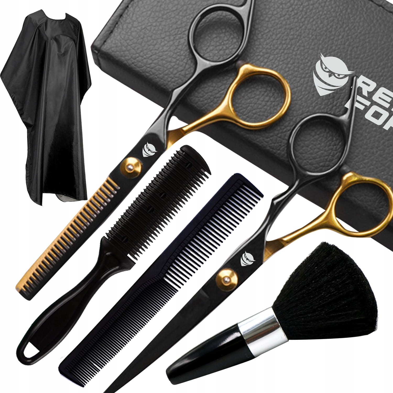 - Nożyczki, degażówki, peleryna, etui, grzebień, pędzel, ściereczka, 2x klips fryzjerski.