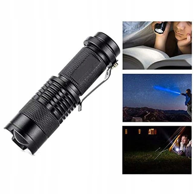 - Latarka z regulowanym strumieniem światła, metalowa obudowa i klips do paska