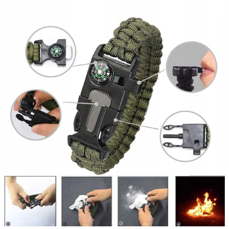 - Opaska paracord z kompasem, gwizdkiem ,krzesiwem i długą liną