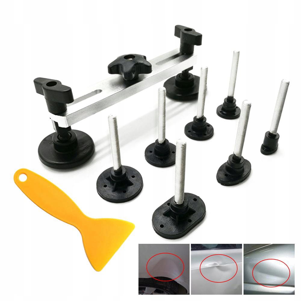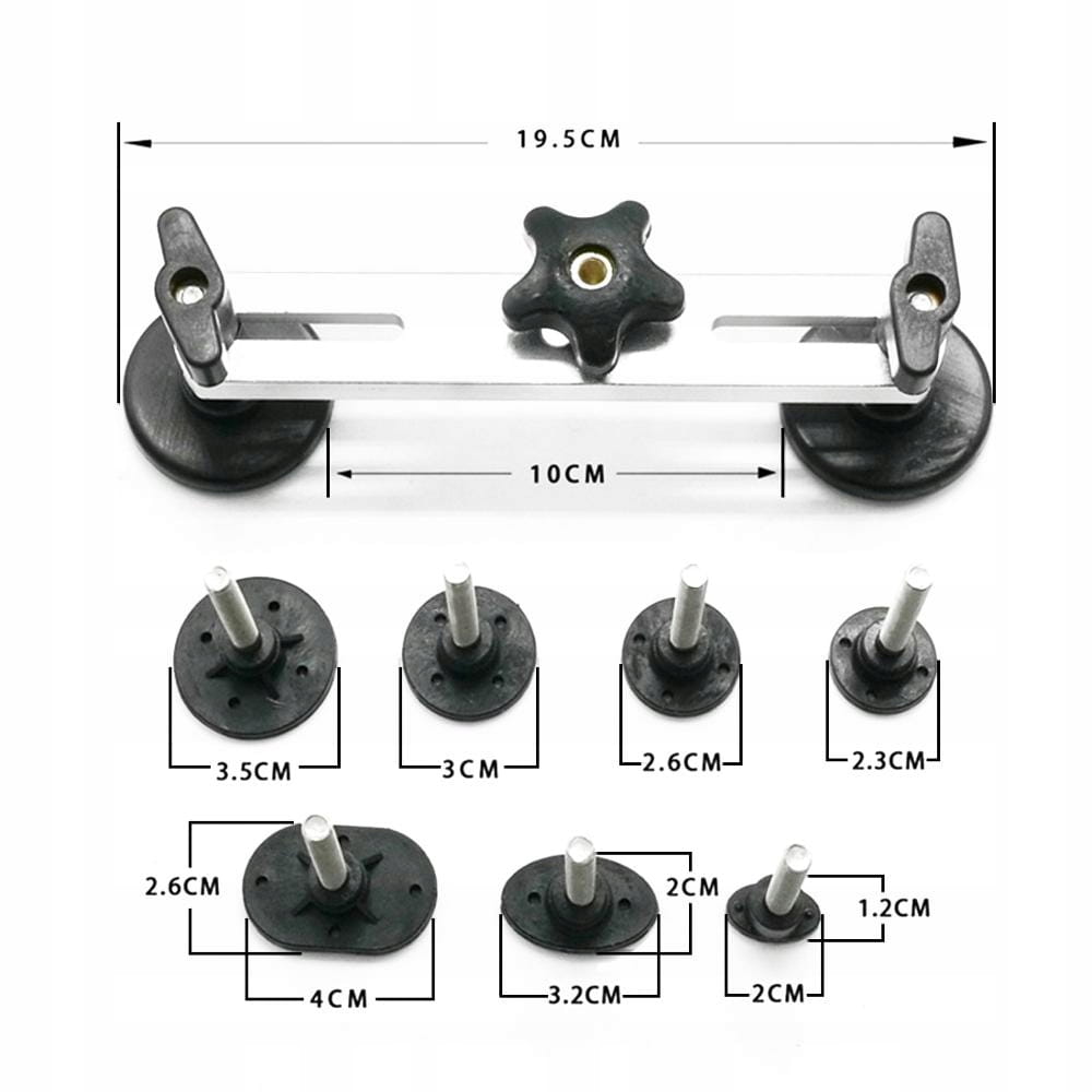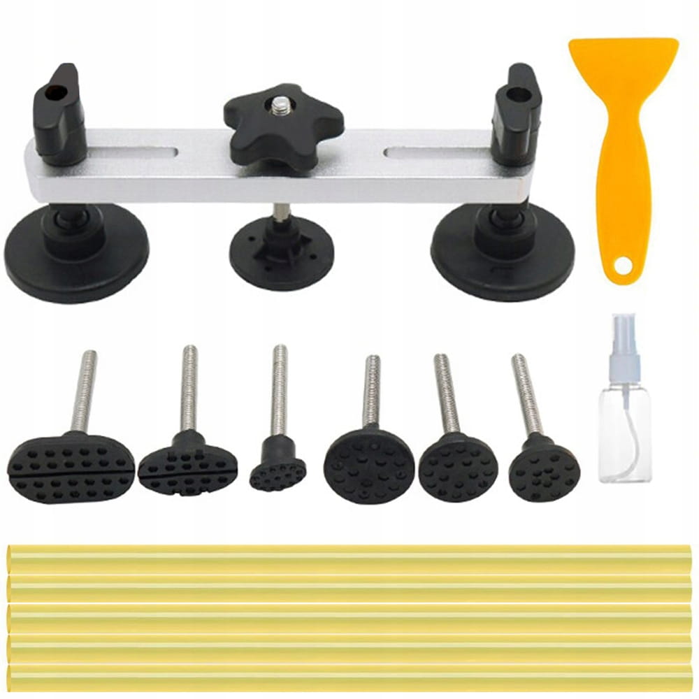 Produkt został wykonany w taki sposób, że jego zastosowanie nie spowoduje uszkodzeń lakieru. Miękkie gumowe podstawki i adaptery, wytrzymały mostek oraz duża śruba ułatwiająca naprawę gwarantują bezpieczeństwo twojego auta. W zestawie znajdują się również sztyfty kleju na ciepło, szpachla do usuwania jego pozostałości oraz pojemnik na preparat odtłuszczający.
