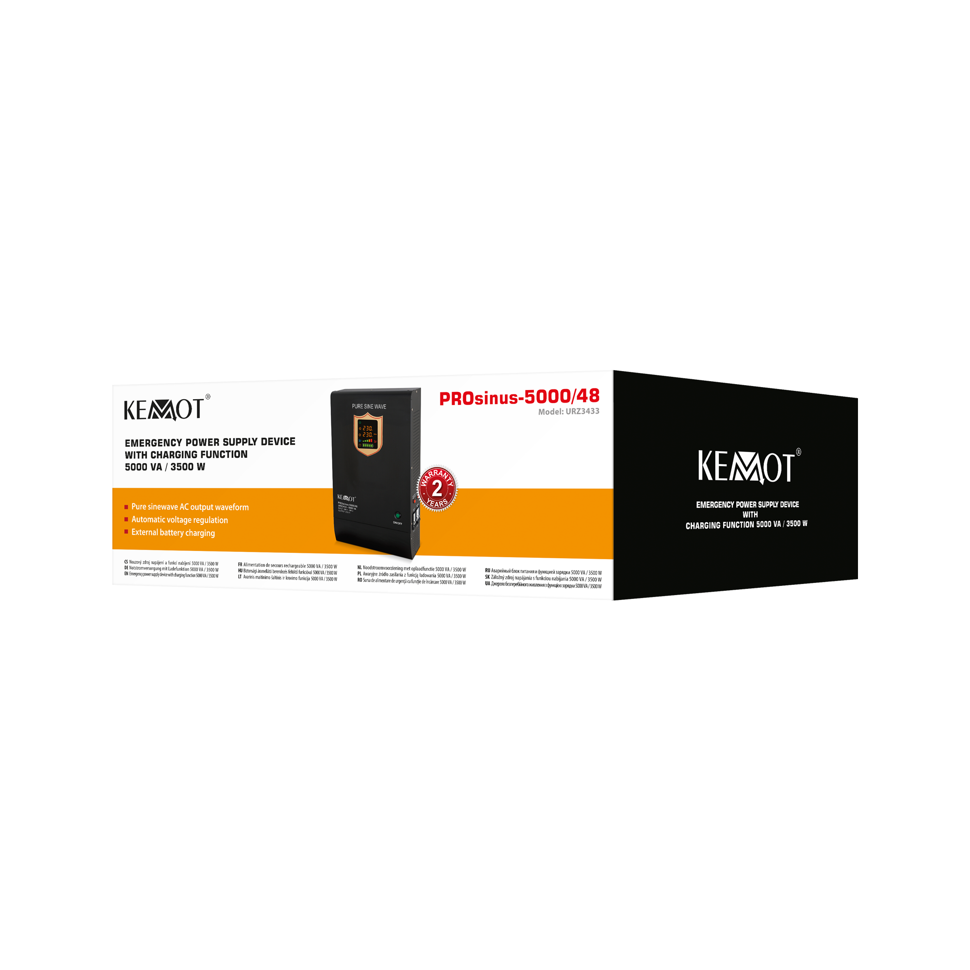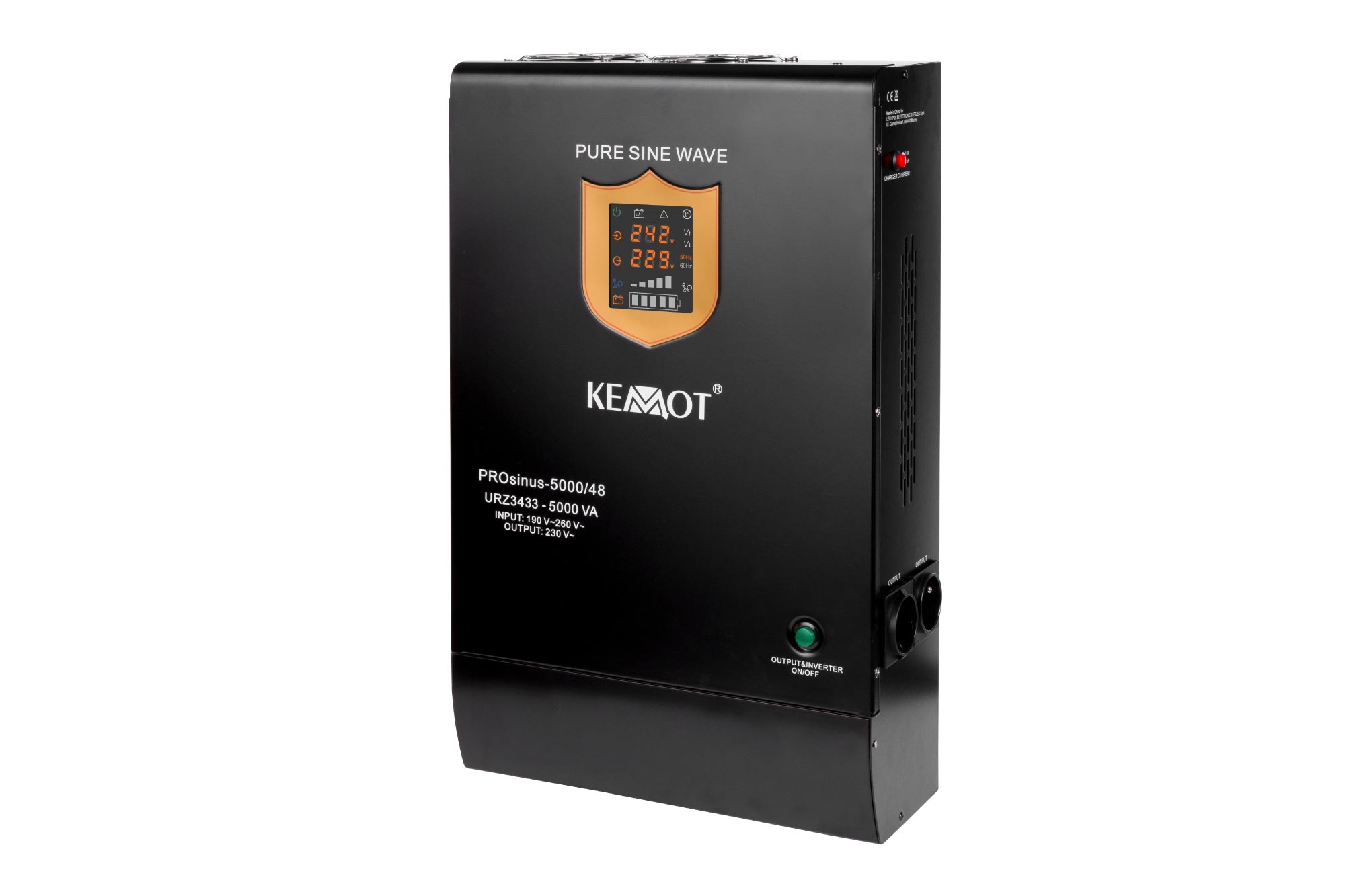 | Nazwa marketingowa | Zasilacz awaryjny KEMOT PROsinus-5000/48 przetwornica z czystym przebiegiem sinusoidalnym i funkcją ładowania 48V 230V 5000VA/3500W - naścienna |