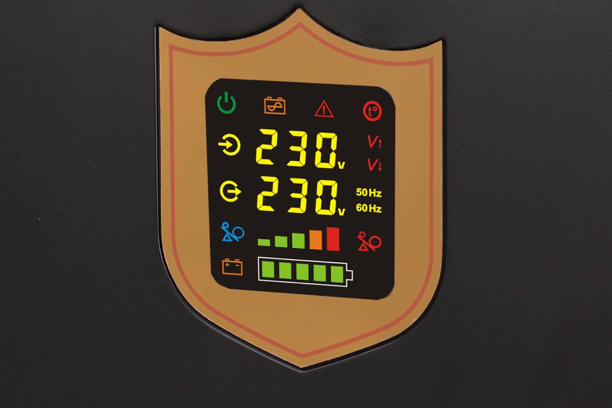 Awaryjne zasilacze KEMOT PROSinus wyposażone są w przejrzysty wyświetlacz LED, który wskaże aktualny status pracy urządzenia. Na wyświetlaczu skontrolujesz m.in. poziom napięcia wejściowego, wyjściowego i częstotliwości. Co więcej szybko sprawdzisz też poziom obciążenia i poziom naładowania baterii