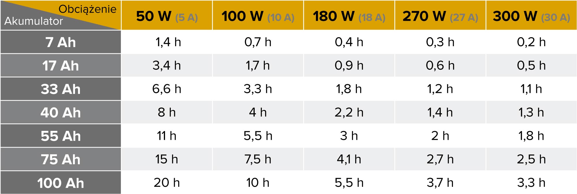 Aby zapewnić najwyższą jakość pracy awaryjnego zasilacza KEMOT należy dobrać do niego odpowiedni akumulator. Doboru optymalnego akumulatora można dokonać korzystając z przybliżonego wzoru: 100 W obciążenia = 10 A poboru z akumulatora.