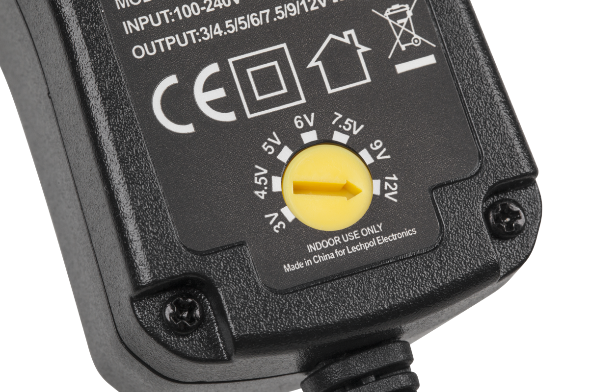 Zasilacz Kemot oferuje regulację napięcia w zakresie od 3 V do 12 V DC (3 V, 4,5 V, 5 V, 6 V, 7,5 V, 9 V, 12 V), co pozwala na dopasowanie do specyficznych wymagań wielu urządzeń. Stabilizowane napięcie zapewnia bezpieczne i niezawodne zasilanie, chroniąc podłączony sprzęt przed uszkodzeniem.